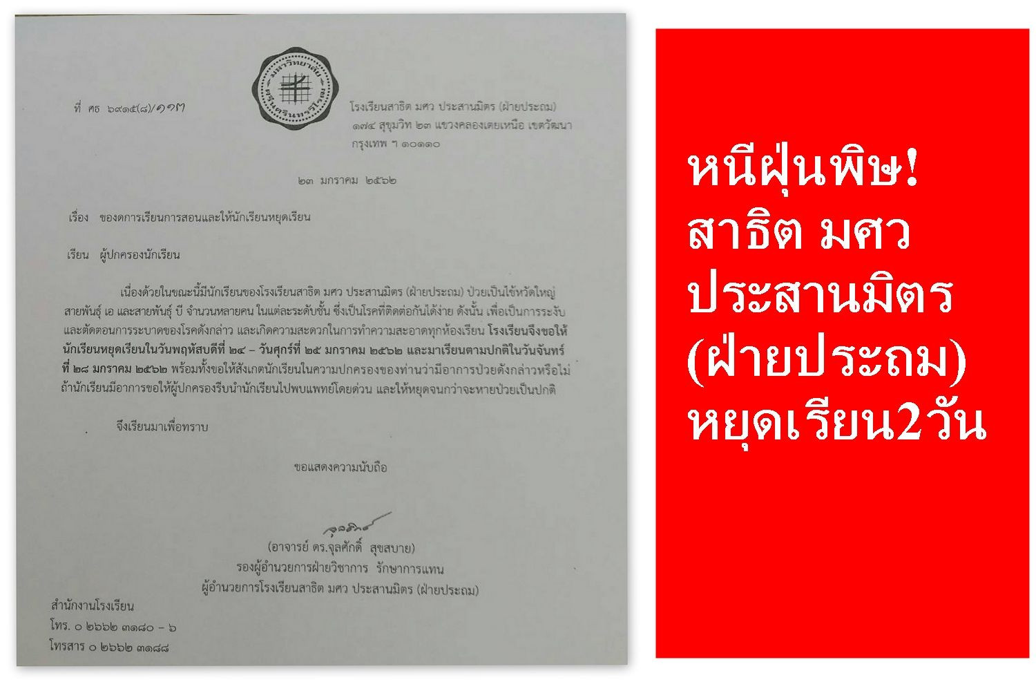สาธิต มศว ประสานมิตร (ฝ่ายประถม) ประกาศหยุดเรียน2วันหนีฝุ่นพิษ หลังนร.เจ็บป่วยไข้หวัดสายพันธุ์เอ และสายพันธุ์บีจำนวนมาก