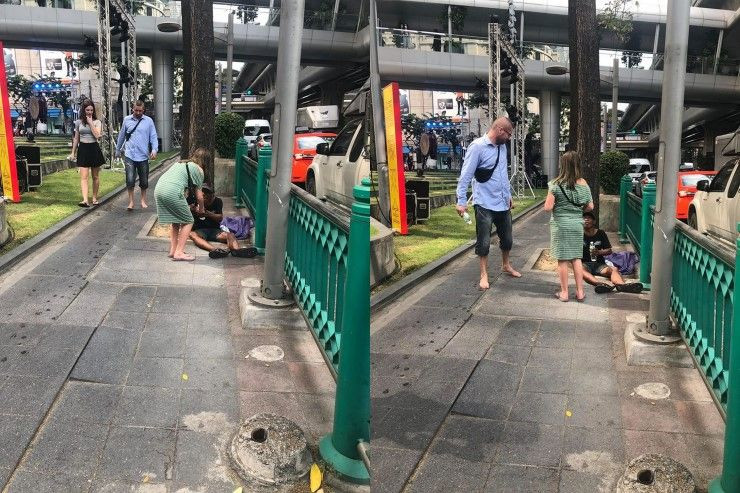 เมื่อวันที่ 3 ก.พ. โลกโซเชียลเน็ตเวิร์กต่างพากันชื่นชมโพสต์ของสมาชิกผู้ใช้เฟซบุ๊ก “Songphol Boonyong” หลังได้เผยแพร่เรื่องราวของชายชาวต่างชาติคนหนึ่งที่มาท่องเที่ยวย่านใจกลางกรุงเทพฯ ซึ่งในระหว่างทางที่จะเข้าห้างสรรพสินค้าได้เจอกับคนเร่ร่อนริมทางเท้า จึงได้ถอดรองเท้าของตนให้กับคนเร่ร่อนพร้อมกับเงินจำนวนหนึ่งในการยังชีพ จนเกิดเป็นเรื่องราวประทับใจและน่าชื่นชมเป็นอย่างมาก โดยเหตุการณ์ดังกล่าวเกิดขึ้นช่วงบ่าย 2 โมง เมื่อวันที่ 1 ก.พ. ที่ผ่านมา