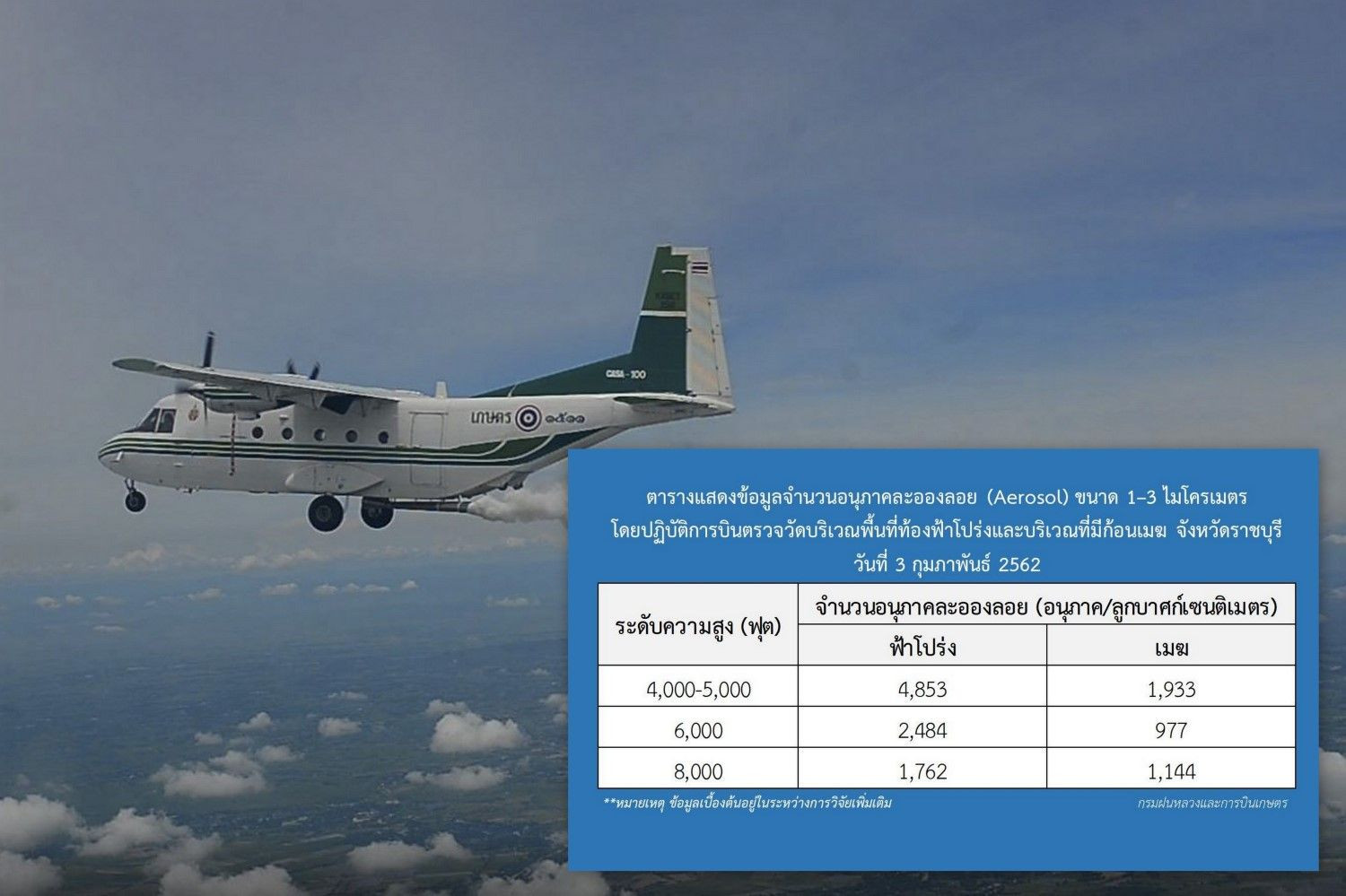นายสุรสีห์ กิตติมณฑล อธิบดีกรมฝนหลวงและการบินเกษตร เปิดเผยว่า จากการที่เครื่องบิน Super King Air ของกรมฝนหลวงฯได้ปฏิบัติการวิจัยศึกษาสภาพอากาศใต้ฐานเมฆว่ามีอิทธิพลต่อการเกิดฝนเป็นอย่างไรระหว่างวันที่ 2-3 ก.พ.ที่ผ่านมา ได้มีการบินเก็บข้อมูลในบริเวณท้องฟ้าโปร่งและบริเวณมีเมฆ โดยใช้เครื่องตรวจวัดค่าอนุภาคละอองลอยในอากาศหรือ ค่าฝุ่นละอองระดับ 1-3 ไมครอน ในระดับใต้ฐานเมฆ (4,000-5,000ฟุต) ระดับกลางของเมฆ (6,000 ฟุต) และระดับเหนือเมฆ (8,000 ฟุต) มีผลการตรวจสภาพอากาศออกมาพบว่า พื้นที่ที่มีเฆมจะมีปริมาณค่าฝุ่นละอองน้อยกว่าพื้นที่บริเวณฟ้าโปร่ง
