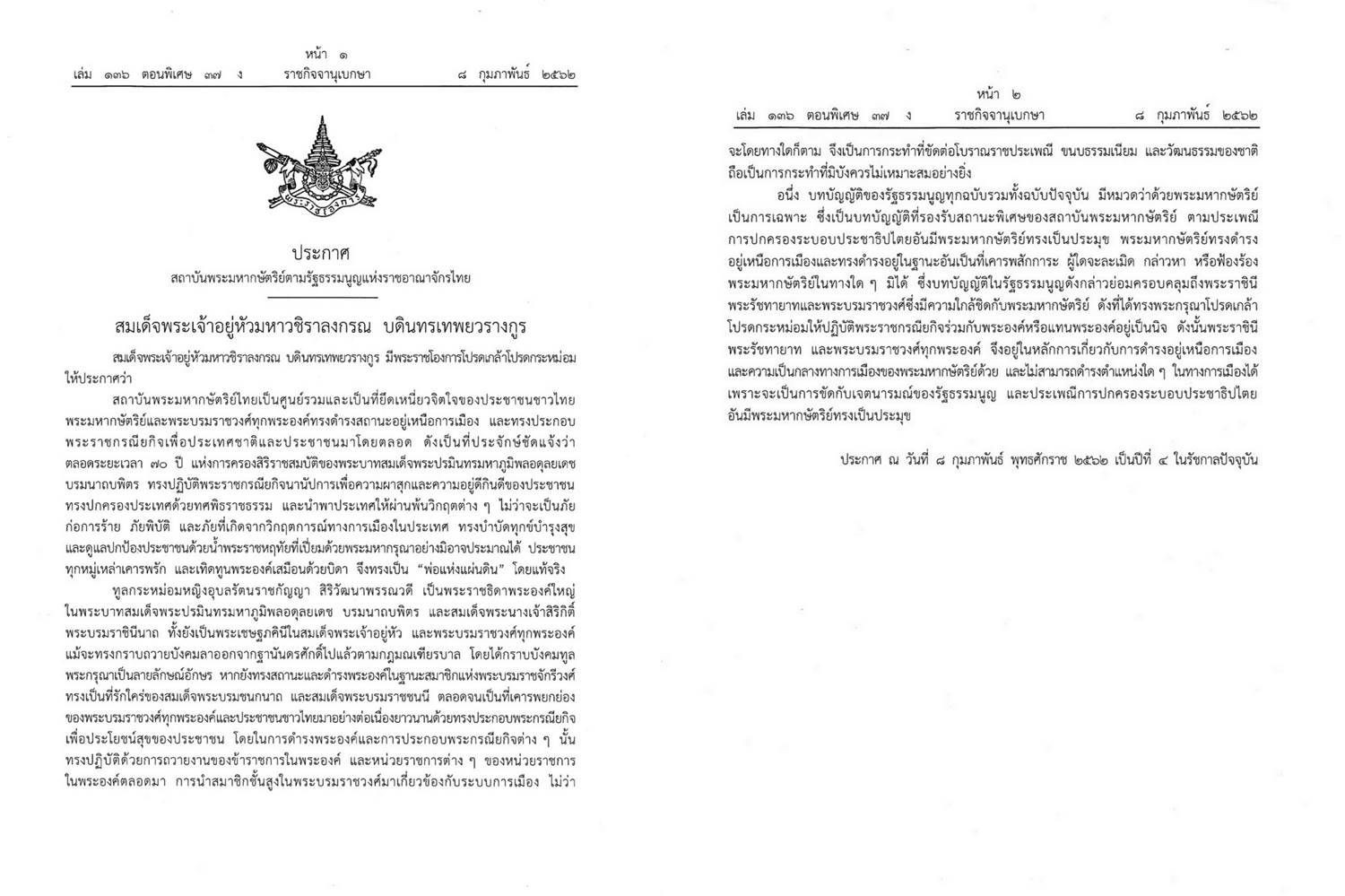 เมื่อวันที่ 8 ก.พ. 62 สมเด็จพระเจ้าอยู่หัวมหาวชิราลงกรณ บดินทรเทพยวรางกูร ทรงมีพระราชโองการเรื่อง ประกาศสถาบันพระมหากษัตริย์ตามรัฐธรรมนูญแห่งราชอาณาจักรไทย โดยมีใจความสำคัญดังนี้