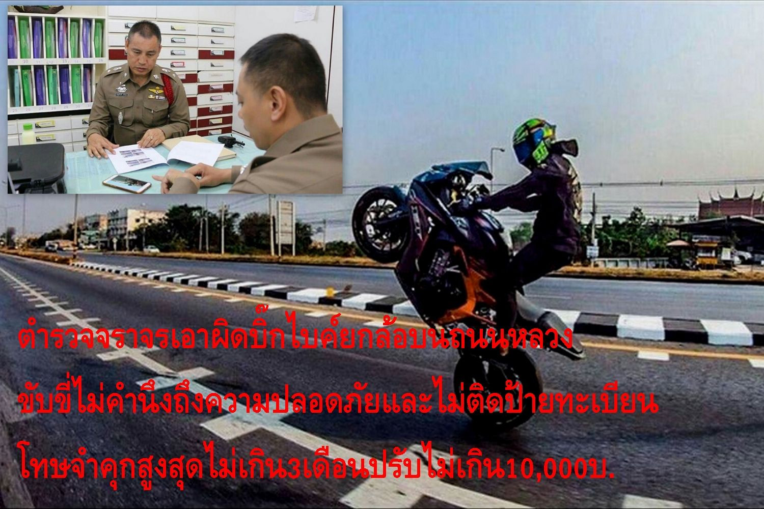 ขอนแก่น-ตำรวจจราจรเอาผิดบิ๊กไบค์ยกล้อบนถนนหลวงขับขี่ไม่คำนึงถึงความปลอดภัยและไม่ติดป้ายทะเบียนโทษจำคุกสูงสุดไม่เกิน3เดือนปรับไม่เกิน10,000บ.หรือทั้งจำทั้งปรับ