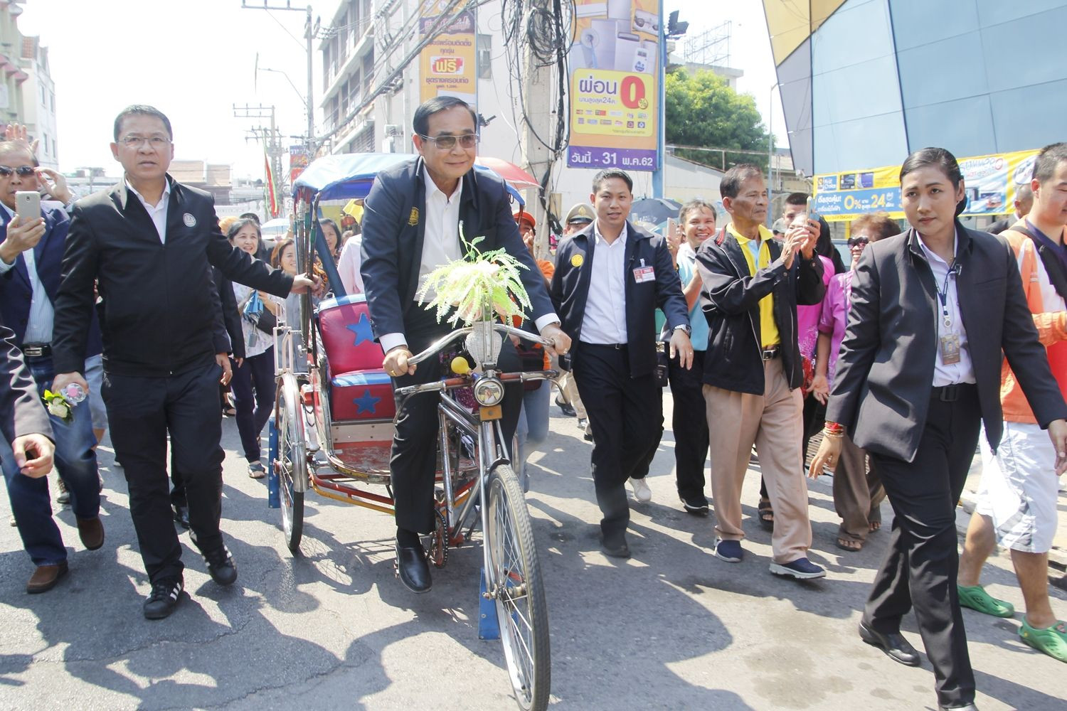จากนั้นได้ขึ้นนั่งจักรยานสามล้อถีบคันแรกที่มีนายจ่อม กิตติสกธ์ อายุ 67 ปี ชาวชุมชนเบญจรงค์ ซอย 2 ที่ยึดอาชีพปั่นสามล้อรับจ้างมานานกว่า 20 ปีเป็นเจ้าของ หมายเลขทะเบียนรถสามล้อ 08960 โดยนายกรัฐมนตรีแย่งสารถีปั่นสามล้อด้วยตัวเองไปได้แค่ 10 เมตร เพราะบังคับแฮนด์ไม่ได้ และหาเบรกล้อไม่เจอ เนื่องจากไม่ถนัด