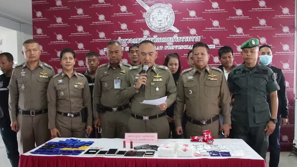 เมื่อวันที่ 26 มี.ค. ที่กองบังคับการตำรวจภูธรนครศรีธรรมราช พล.ต.ต.ฐากูร เนตรพุกกณะ ผบก.จว.นครศรีธรรมราช แถลงจับกุมแก๊งค้ายาเสพติด พร้อมของกลางยาบ้า 21,160 เม็ด ไอซ์ 76.94 กรัม อาวุธปืนและเครื่องกระสุน รวมทั้งโทรศัพท์มือถืออีก 5 เครื่อง ได้ผู้ต้องหาจำนวน 5 ราย คือนายเฉลิมศักดิ์ นมาภรณ์ อายุ 28 ปี , นายทินกร ชูแท่น อายุ 31 ปี , นายเกียรติขจร หมอบุญ อายุ 33 ปี , นายวิษณุ ชูแก้ว อายุ 27 ปี