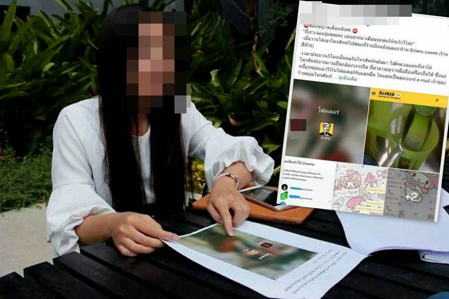 ต่อมา ผู้สื่อข่าวจึงได้ติดต่อไปยังเจ้าของเฟซบุ๊กที่ได้รับความเสียหาย เป็นหญิงสาวอายุ 20 ปี นักศึกษาของมหาวิทยาลัยแห่งหนึ่ง โดยได้เล่าเหตุการณ์ที่เกิดขึ้นว่า เมื่อช่วงเช้าของวันที่ 26 มี.ค.ที่ผ่านมาได้นำโทรศัพท์มือถือไปซ่อมที่ร้านรับซ่อมโทรศัพท์มือถือแห่งหนึ่งหลังมหาวิทยาลัย โดยได้ตกลงราคาค่าซ่อมที่ 1,500 บาท และในช่วงเย็นจึงไปรับโทรศัพท์กลับมา แต่เมื่อเปิดโทรศัพท์ดูกลับพบว่ายังมีอาการเหมือนเดิม จึงแจ้งเจ้าของร้านไป โดยร้านขอค่าเปิดเครื่องซ่อม 700 บาท จึงยอมให้ไป แต่เมื่อกลับมาถึงที่พัก เปิดโทรัพท์ดูอีกครั้งกลับพบว่ามีแอพพลิชั่นชื่อ "อัลเฟรด" ติดตั้งมาในโทรศัพท์ด้วย
