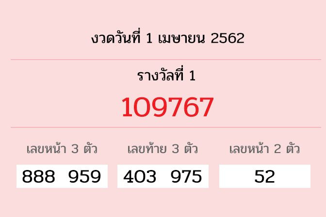 ผลสลากงวด 1 เม.ย. 62 รางวัลที่1 คือ 109767 /3ตัวหน้า888,959 ท้าย 403,975 และ2ตัว 52