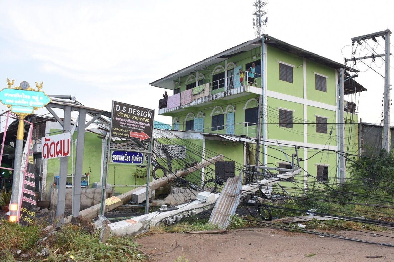 ด้าน นางอำไพ สาระไทย อายุ 57 ปี กล่าวว่า ขณะที่นอนดูทีวีอยู่ภายในห้องนอน ได้เกิดมีลมฝนพัดมาเสียงดังมาก จึงไม่ออกไปจากนอกห้อง สักพักได้ยินเสียงอะไรหล่นใส่หลังคาบ้าน ก่อนฝ้าจะหล่นลงมาทับตนเองที่นอนอยู่บนที่นอน แต่ก็ไม่ได้รับบาดเจ็บอะไร เมื่อฝนหยุดจึงเดินออกมาดูก็พบว่า เสาสัญญาณโทรศัพท์ของ เอไอเอส ล้มลงมาทับหลังคาบ้านตนเองและญาติๆ อีก 1 หลังที่อยู่ติดกัน