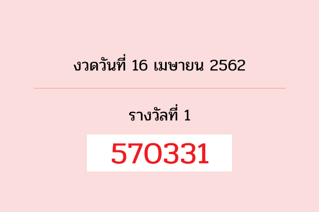 ผลสลากงวด 16 เม.ย. 62 รางวัลที่1 คือ570331/3ตัวหน้า512/930ท้าย966/968และ2ตัว 23