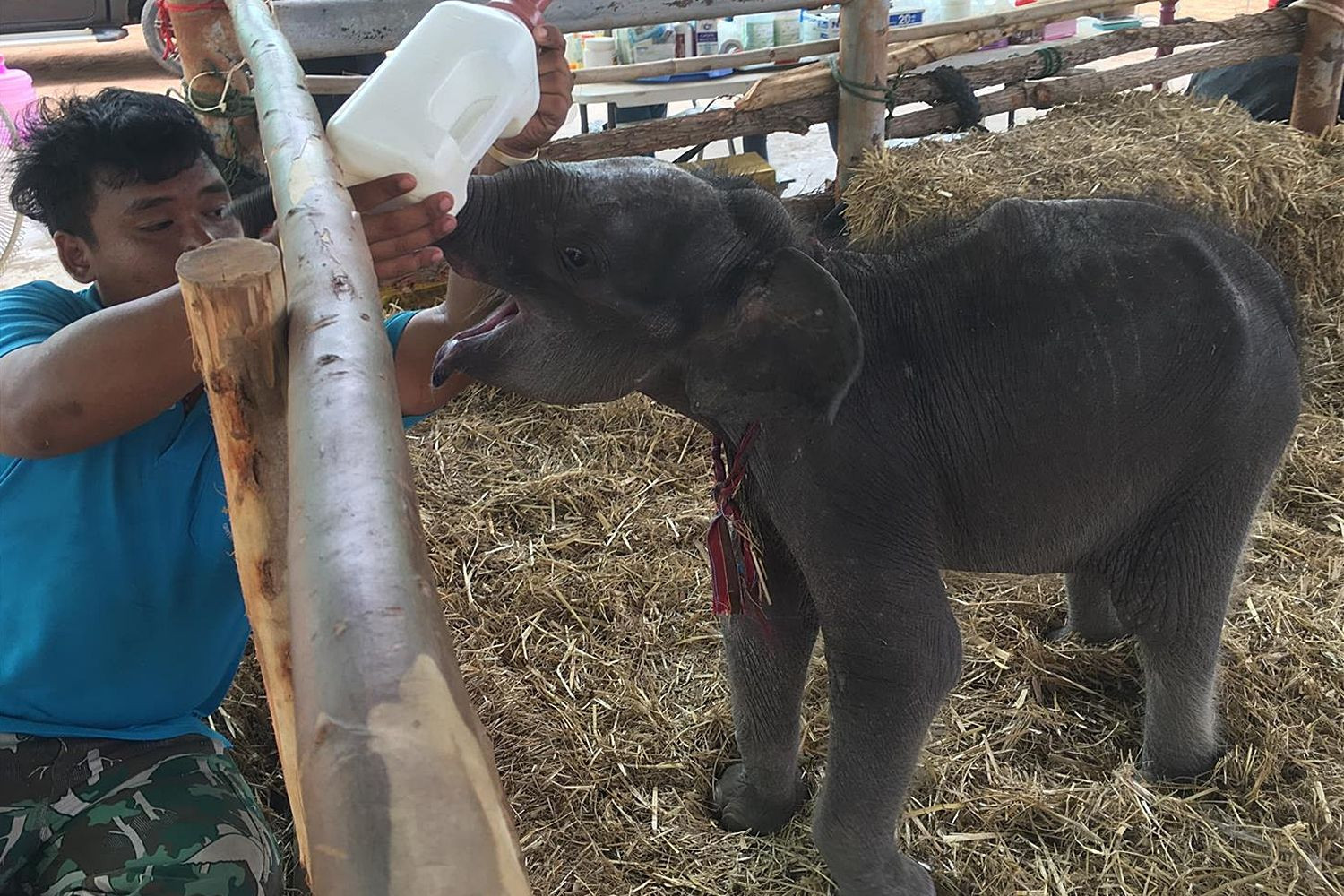 สุรินทร์-ลูกช้างป่าบาดเจ็บตกบ่อเกรอะอาการดีขึ้นโครงการคชอาณาจักรจัดแม่เลี้ยงให้กินนมจากเต้าเล็งส่งกลับไปอยู่กับแม่ที่แท้จริง