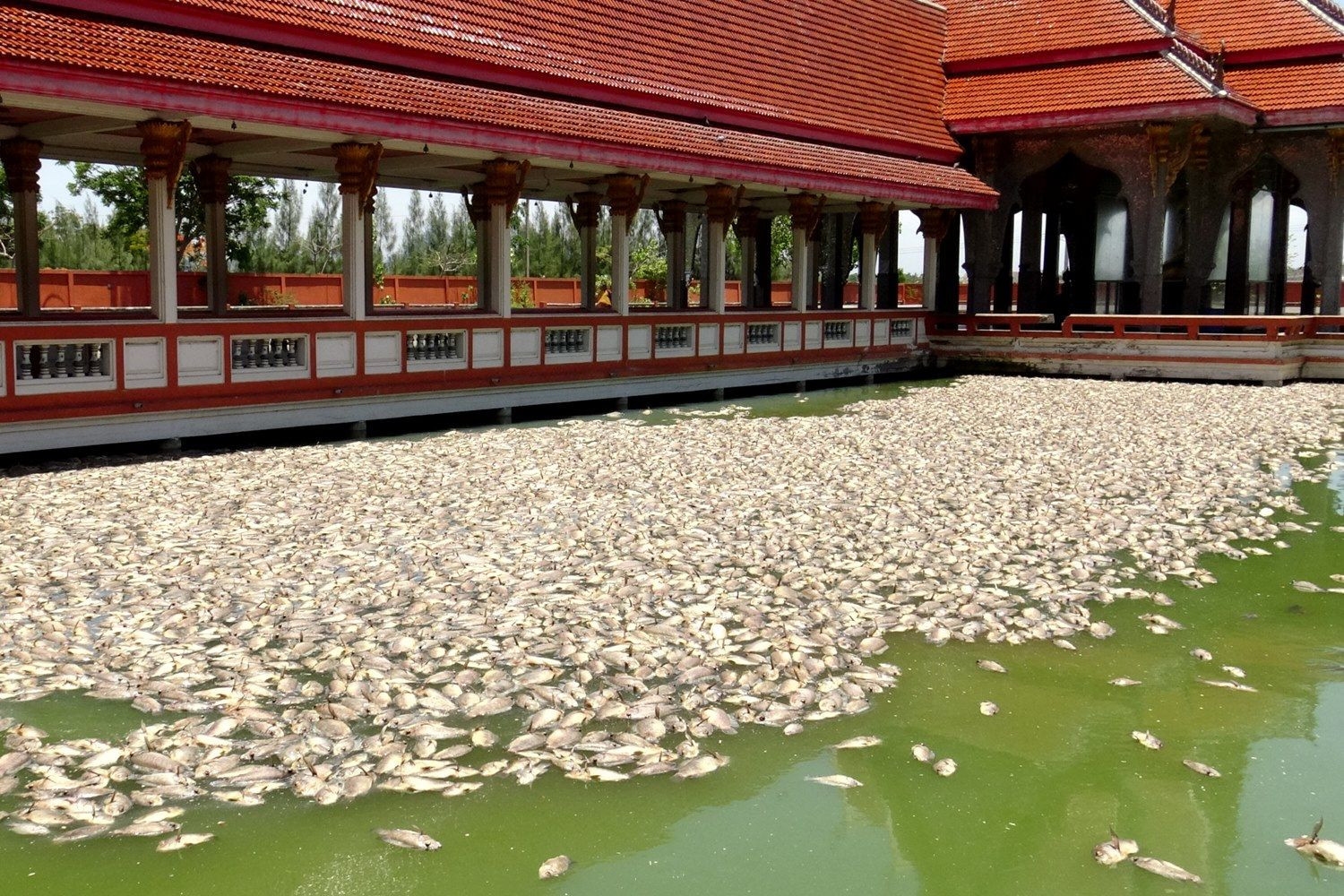 ทั้งนี้ มีพระสังเกตุเห็นมีปลาเริ่มลอยตายตั้งแต่วันที่ 26 เม.ย. ก่อนจะตายลอยอืดขึ้นเป็นจำนวนมากตั้งแต่เมื่อวาน และวันนี้ตายเพิ่มหลายเท่าตัว ส่งกลิ่นเหม็นเน่า น้ำภายในสระจากที่เคยใสเปลี่ยนเป็นสีเขียวขุ่นเข้ม ทางวัดจึงให้สามเณรโพสต์ภาพ เพื่อขอความช่วยเหลือจากญาติโยม เพื่อตัดปลาที่ตายออกจากสระน้ำโดยเร็ว เพื่อช่วยเหลือปลาที่ยังไม่ตายอีกเป็นจำนวนมาก