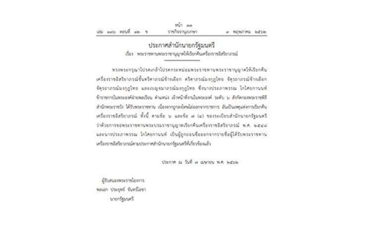 เมื่อวันที่ 3 พ.ค. เว็บไซต์ราชกิจจานุเบกษา เผยแพร่ประกาศสำนักนายกฯ เรื่อง พระราชทานพระราชานุญาตให้เรียกคืนเครื่องราชอิสริยาภรณ์ ใจความว่า ทรงพระกรุณาโปรดเกล้าโปรดกระหม่อมพระราชทานพระราชานุญาตให้เรียกคืนเครื่องราชอิสริยาภรณ์ชั้นตริตาภรณ์ช้างเผือก ตริตาภรณ์มงกุฎไทยจัตุรถาภรณ์ ช้างเผือก จัตุรถาภรณ์มงกุฎไทย และเบญจมาภรณ์มงกุฎไทย ซึ่งนางประภาพรรณ โกไศยกานนท์ ข้าราชการในพระองค์ฝ่ายพลเรือน ตําแหน่ง เจ้าหน้าที่งานในพระองค์ ระดับ 6 สังกัดกองพระราชพิธีสํานักพระราชวัง ได้รับพระราชทาน เนื่องจากถูกลงโทษไล่ออกจากราชการอันเป็นเหตุแห่งการเรียกคืนเครื่องราชอิสริยาภรณ์ ทั้งนี้ ตามข้อ 6 และข้อ 7 (4) ของระเบียบสํานักนายกรัฐมนตรี ว่าด้วยการขอพระราชทานพระบรมราชานุญาตเรียกคืนเครื่องราชอิสริยาภรณ์ พ.ศ.2548 และนางประภาพรรณ โกไศยกานนท์ เป็นผู้ ถูกถอนชื่อออกจากรายชื่อผู้ได้ รับพระราชทาน เครื่องราชอิสริยาภรณ์ตามประกาศสํานักนายกรัฐมนตรี ที่เกี่ยวข้องแล้ว