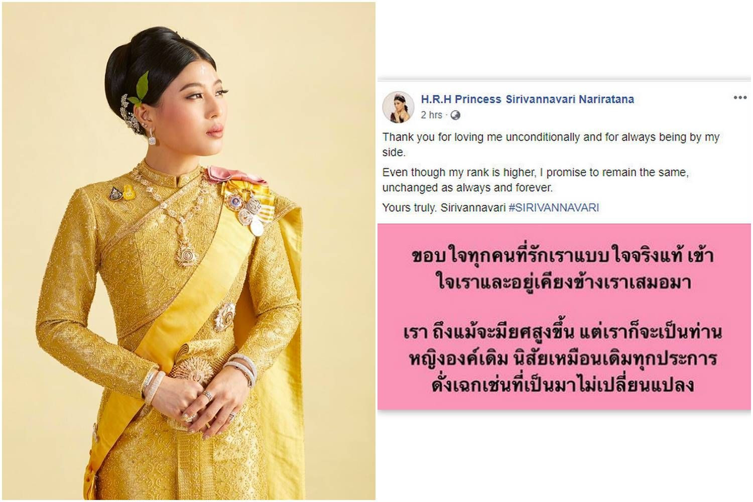 เมื่อวันที่ 6 พ.ค. 62 สมเด็จพระเจ้าลูกเธอ เจ้าฟ้าสิริวัณณวรี นารีรัตนราชกัญญา ทรงโพสต์ข้อความผ่านเฟซบุ๊กส่วนพระองค์ H.R.H Princess Sirivannavari Nariratana ระบุความว่า "ขอบใจทุกคนที่รักเราแบบใจจริงแท้ เข้าใจเราและอยู่เคียงข้างเราเสมอมา เราถึงแม้จะมียศสูงขึ้น แต่เราก็จะเป็นท่านหญิงองค์เดิม นิสัยเหมือนเดิมทุกประการ ดั่งเช่นที่เป็นมาไม่เปลี่ยนแปลง"