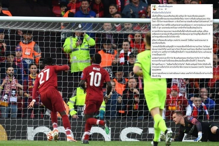 โดยโพสต์ดังกล่าวระบุถอดบทเรียนจากเกมฟุตบอลในนัดนี้ ซึ่งโอกาสที่ทีมลิเวอร์พูลจะเข้ารอบมีน้อยมากหลังต้องเอาชนะ 4 ประตู และต้องระวังอย่างหนักที่จะไม่เสียประตู เปรียบเหมือนพวกเขาต้องฝ่าฟันอุปสรรคที่เหมือนภูเขาลูกใหญ่ที่สูงเสียดฟ้า ที่อะไรๆ ดูเหมือนจะเป็นไปได้ยากยิ่ง แต่ทัศนคติของผู้จัดการทีมลิเวอร์พูลย้ำให้เราฟังอีกครั้งว่าทุกอย่างเป็นไปได้ ตราบใดที่เรามีความพยายามและความหวัง ไม่ย่อท้อต่ออุปสรรค ทุกความมุ่งมั่นพยายามล้วนมีคุณค่าเสมอ และจิตใจที่เข้มแข็งกล้าแกร่งเป็นเรื่องสำคัญ