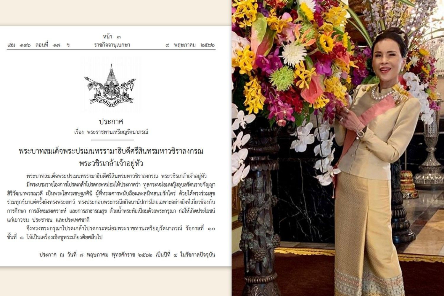 เมื่อวันที่ 9 พ.ค. 62 ราชกิจจานุเบกษา เผยแพร่พระบรมราชโองการประกาศเรื่อง พระราชทานเหรียญรัตนาภรณ์ ความว่า พระบาทสมเด็จพระปรเมนทรรามาธิบดีศรีสินทรมหาวชิราลงกรณ พระวชิรเกล้าเจ้าอยู่หัว มีพระบรมราชโองการโปรดเกล้าโปรดกระหม่อมให้ประกาศว่า ทูลกระหม่อมหญิงอุบลรัตนราชกัญญา สิริวัฒนาพรรณวดี เป็นพระโสทรเชษฐภคินี ผู้ที่ทรงเคารพนับถือและสนิทสนมรักใคร่ ด้วยได้ทรงร่วมสุขร่วมทุกข์มาแต่ครั้งยังทรงพระเยาว์ ทรงประกอบพระกรณียกิจนานัปการโดยเฉพาะอย่างยิ่งที่เกี่ยวข้องกับการศึกษา การสังคมสงเคราะห์ และการสาธารณสุข ด้วยน้้าพระทัยเปี่ยมด้วยพระกรุณา ก่อให้เกิดประโยชน์