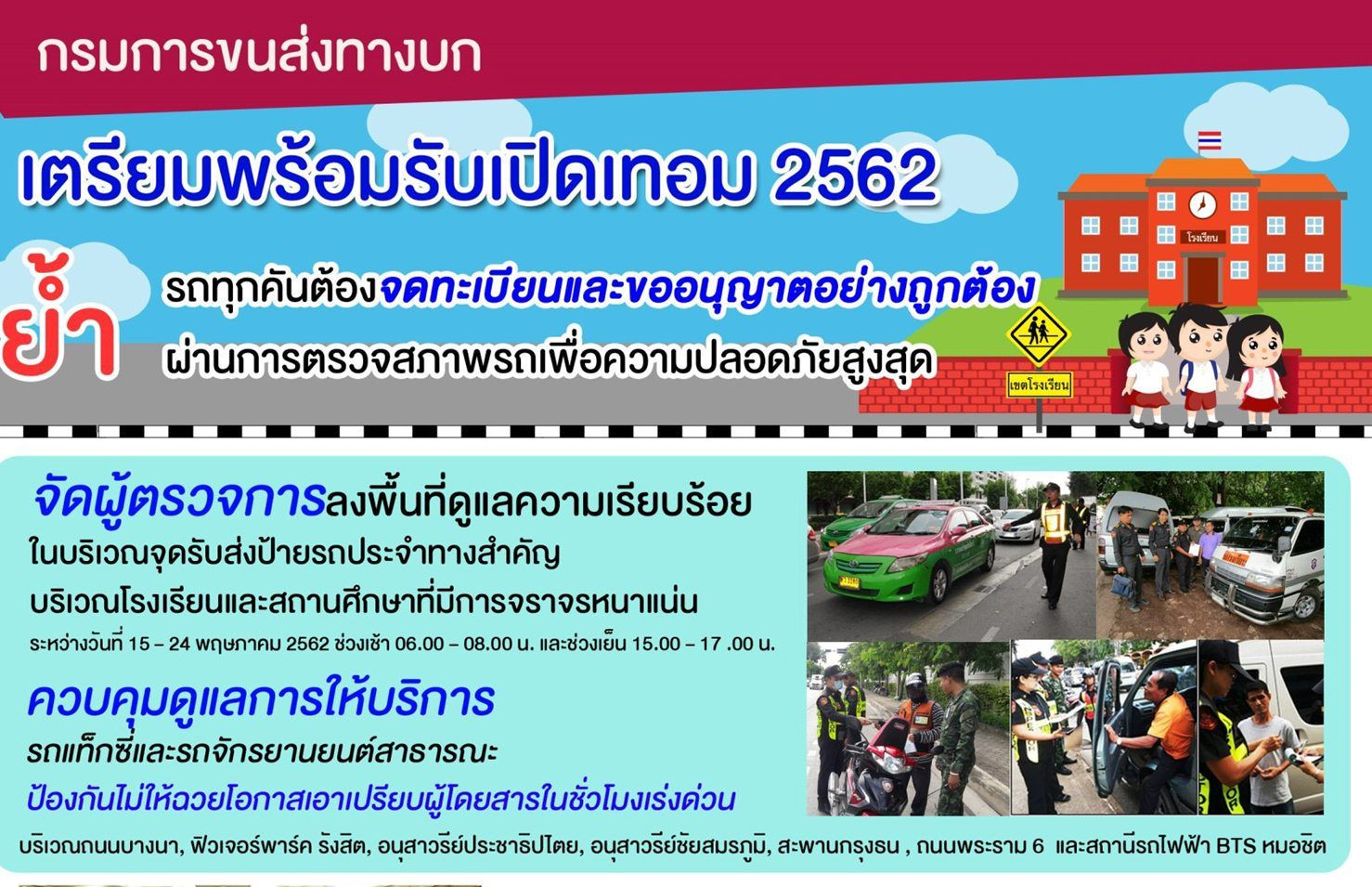 กรมการขนส่งทางบก วางมาตรการรับเปิดเทอม 2562 จัดผู้ตรวจการลงพื้นที่ดูแลความเรียบร้อยในบริเวณจุดรับส่งป้ายรถประจำทางสำคัญ บริเวณโรงเรียนและสถานศึกษาที่มีการจราจรหนาแน่น
