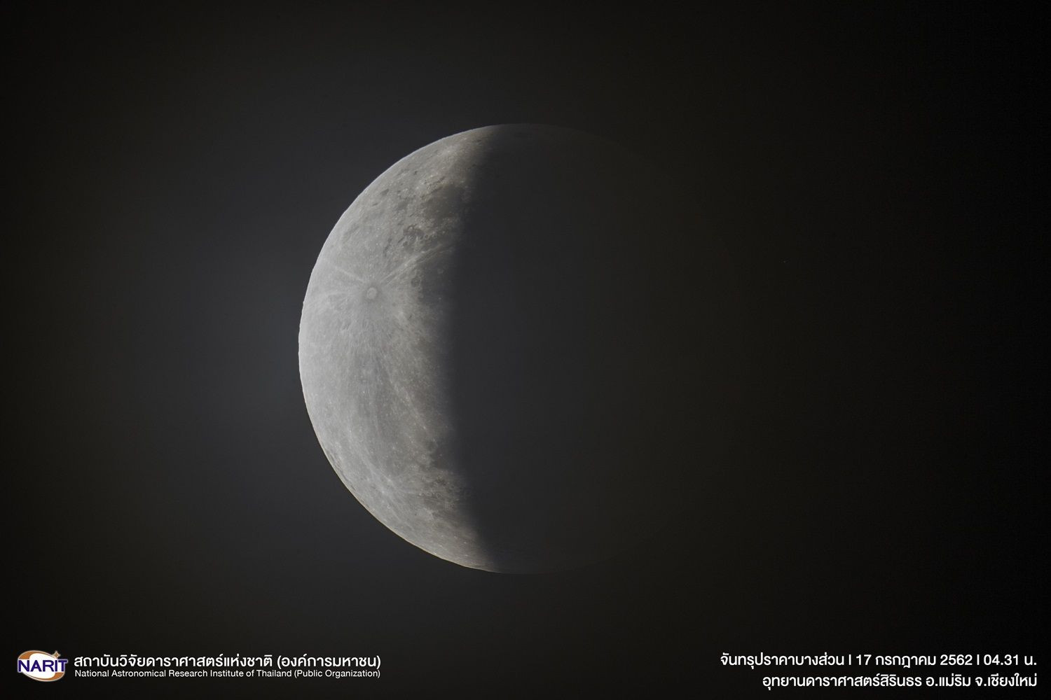 นายศุภฤกษ์ คฤหานนท์ หัวหน้างานบริการวิชาการทางดาราศาสตร์ สดร. เผยว่า เช้ามืดวันที่ 17 กรกฎาคม 2562 ตั้งแต่เวลาประมาณ 03.02-05.59 น. (ตามเวลาประเทศไทย) เกิดปรากฏการณ์จันทรุปราคาบางส่วน เกิดจากดวงอาทิตย์ โลก และดวงจันทร์โคจรมาอยู่ในแนวเดียวกัน มีโลกอยู่กลางระหว่างดวงอาทิตย์กับดวงจันทร์ โดยดวงจันทร์โคจรเข้าไปในเงามืดของโลกแค่บางส่วน ทำให้มองเห็นดวงจันทร์เต็มดวงมีลักษณะเว้าแหว่ง เห็นแจ่มชัดหลายพื้นที่ อาทิ เชียงราย เชียงใหม่ ขอนแก่น อุดรธานี ชัยนาท กรุงเทพฯ นนทบุรี ปทุมธานี สมุทรปราการ ฉะเชิงเทรา ประจวบคีรีขันธ์ ชุมพร พัทลุง