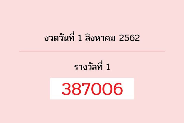 ผลสลากกินแบ่งรัฐบาล งวดวันที่ 1 ส.ค. 62 รางวัลที่1คือ 387006 เลขหน้า3ตัว 983 / 135 ท้าย3ตัว 795 / 562 เลขท้าย 2 ตัว 58