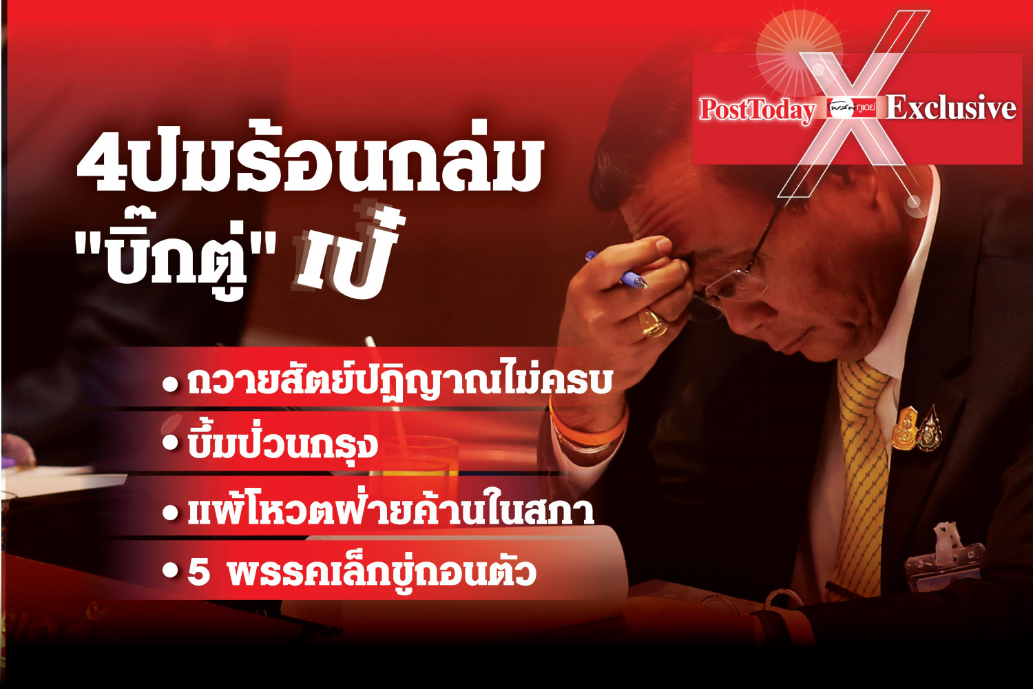 ทั้งนี้เนื่องจาก เพียงแค่ 15วัน ของการเข้ามาบริหารประเทศ"บิ๊กตู่"โดนหนักจนแทบจะโงหัวไม่ขึ้น ไม่สามารถตีปิ๊บการขับเคลื่อนนโยบายที่เป็นความหวังของประชาชนได้ เพราะมีแต่กระแสข่าว เรื่องแก้ปัญหาทางการเมืองของรัฐบาลรายวัน โดยเฉพาะในช่วงที่ผ่านมา"บิ๊กตู่"ต้องเผชิญปัญหาให้ปวดขมับถึง 4 ปมใหญ่ด้วยกัน