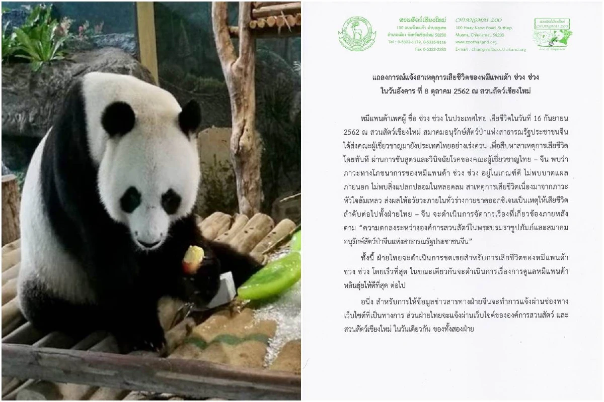 สวนสัตว์เชียงใหม่ออกแถลงการณ์ระบุสาเหตุการตายของ "แพนด้า ช่วง ช่วง" เกิดจากภาวะหัวใจล้มเหลว