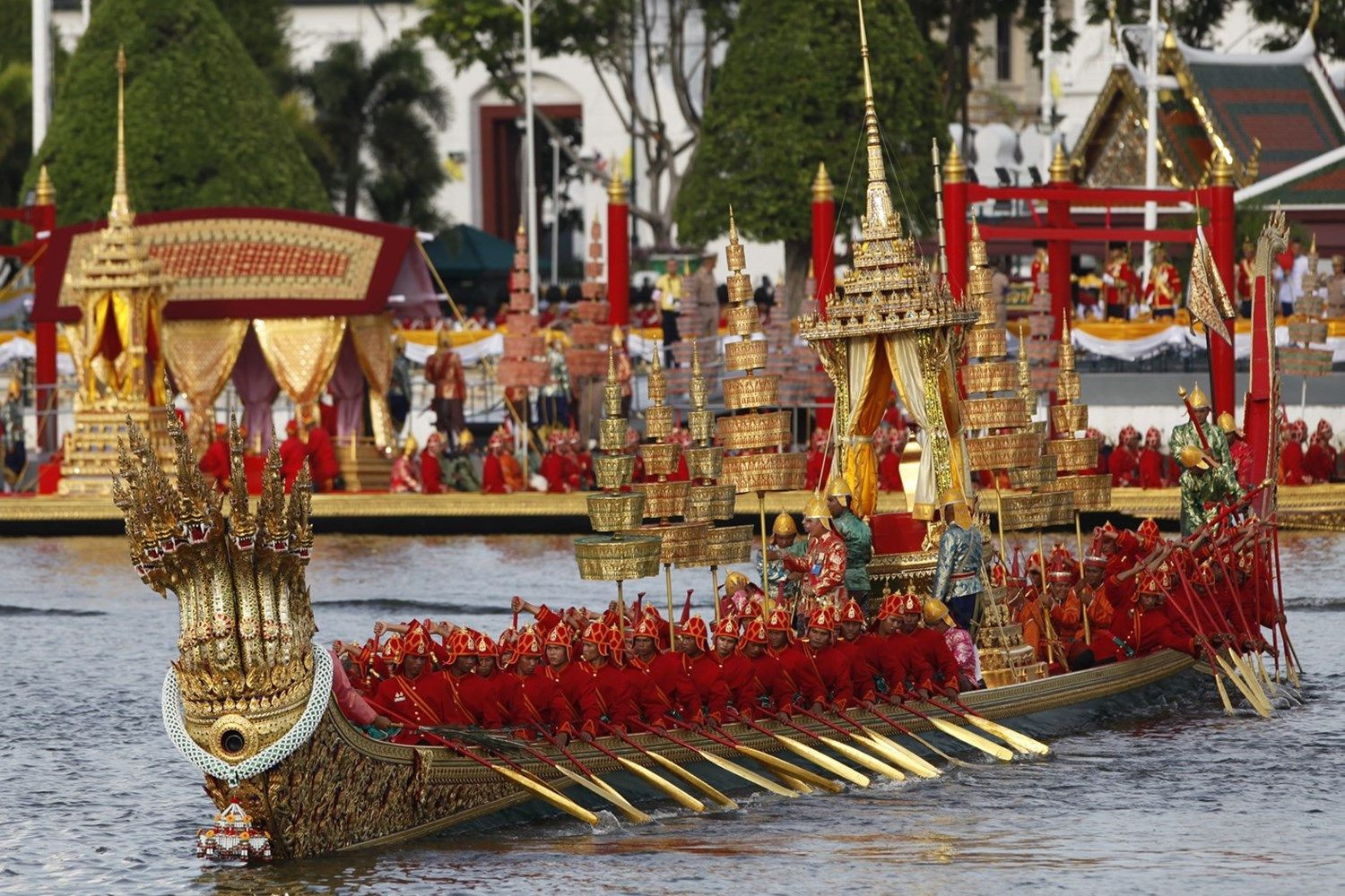 จากนั้นในเวลา 15.52 น. ขบวนเรือได้เคลื่อนออกจากจุดตั้งขบวนมุ่งหน้าไปทาง พระบรมมหาราชวัง ระยะทางประมาณ 4 กิโลเมตร ใช้เวลาในการเคลื่อนขบวนจากจุดเริ่มต้นถึงที่หมายประมาณ 40 นาที ซึ่งการซ้อมขบวนเรือพระราชพิธีในวันนี้ เป็นการจัดรูปขบวนตามรูปแบบโบราณ ราชประเพณีทุกประการ โดยจัดรูปขบวนเรือ แบ่งออกเป็น 5 ริ้ว 3 สาย ดังนี้