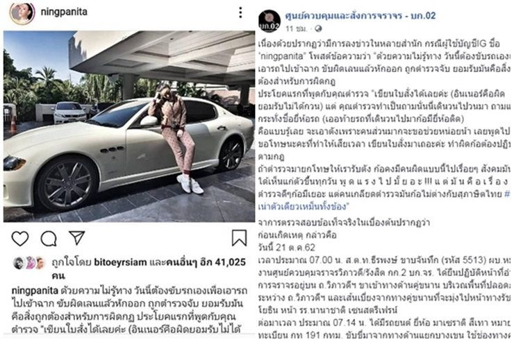 เพจเฟซบุ๊ก ศูนย์ควบคุมและสั่งการจราจร บก.02 โพสต์ภาพและข้อความ ระบุว่า เนื่องด้วยปรากฏว่ามีการลงข่าวในหลายสำนัก กรณีผู้ใช้บัญชีIG ชื่อ “ningpanita” โพสต์ข้อความว่า “ด้วยความไม่รู้ทาง วันนี้ต้องขับรถเองเพื่อเอารถไปเข้าฉาก ขับผิดเลนแล้วหักออก ถูกตำรวจจับ ยอมรับมันคือสิ่งถูกต้องสำหรับการผิดกฎ ประโยคแรกที่พูดกับคุณตำรวจ “เขียนใบสั่งได้เลยค่ะ (อินเนอร์คือผิดยอมรับไม่ได้กวน) แต่ คุณตำรวจทำเป็นถามนั่นนี่เดินวนไปวนมา ถามแม้กระทั่งชื่อยี่ห้อรถ (เออท้ายรถที่เดินวนไปมาก้อมียี่ห้อติด) คือแบบรู้เลย จะเอาตังเพราะคนส่วนมากจะขอช่วยหน่อยน้า เลยพูดไปว่า ขอโทษนะคะที่ทำให้เสียเวลา เขียนใบสั่งมาเถอะค่ะ ทำผิดก้อต้องปฏิบัติตามกฎ ถ้าตำรวจมายกโทษให้เรารับตัง ก้อคงมีคนผิดแบบนี้ไปเรื่อยๆ สังคมมันถึงได้เห็นแก่ตัวขึ้นทุกวัน พู ด แ ร ง ไ ป มั้ ย อ ะ !!! แ ต่ มั น คื อ เ รื่ อ ง จ ริ ง ตำรวจดีๆก้อมีเยอะ แต่คนเกลียดตำรวจมันก้อไม่ต่างกับสุภาษิตไทย #ปลาเน่าตัวเดียวเหม็นทั้งข้อง”