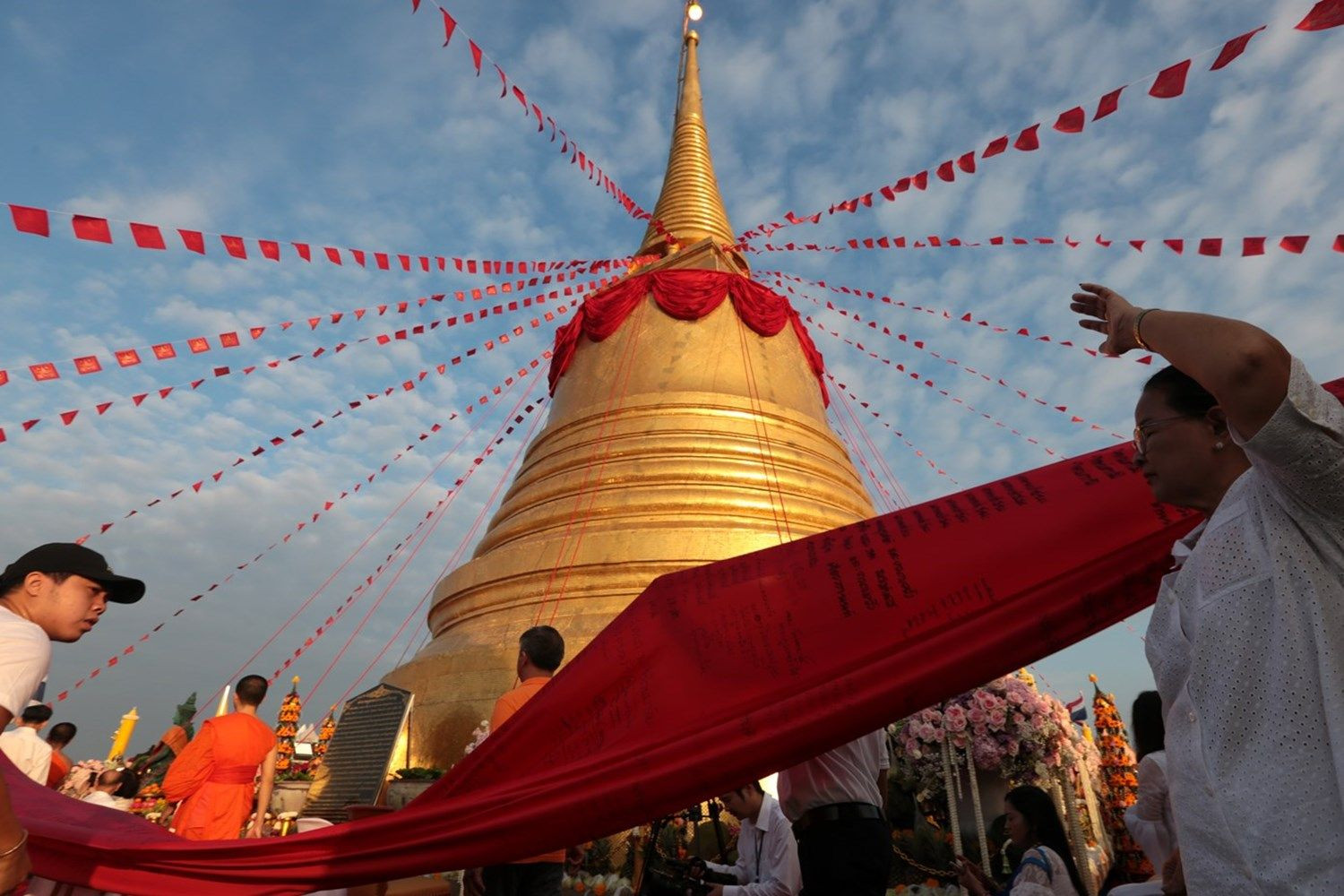 เมื่อวันที่ 4 พ.ย. พุทธศาสนิกชนเข้าร่วมพิธีอัญเชิญผ้าแดงห่มองค์พระบรมบรรพต (ภูเขาทอง) ในงานสมโภชองค์พระบรมสารีริกธาตุ @ บริเวณพระบรมบรรพต (ภูเขาทอง) และลานวิหาร วัดสระเกศราชวรมหาวิหาร
