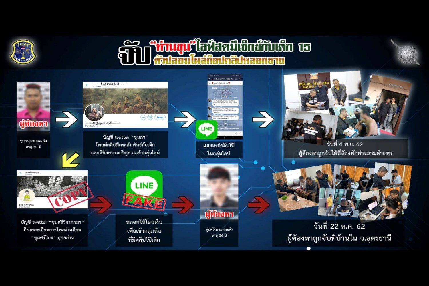 เมื่อวันที่ 7 พ.ย. 62 พล.ต.ท.จารุวัฒน์ ไวศยะ ผู้ช่วย ผู้บัญชาการตำรวจแห่งชาติ (ผู้ช่วยผบ.ตร.) ในฐานะ ผอ.ศพดส.ตร.สั่งการให้ชุดปฏิบัติการปราบปรามการล่วงละเมิดทางเพศต่อเด็กทางอินเตอร์เน็ต? สำนักงานตำรวจแห่งชาติ หรือ TICAC ทำการสืบสวนจับกุมผู้ใช้ชื่อทวิตเตอร์ "ขุนกร" หรือ "ขุนศรีวิกรกามา" ที่มีพฤติการณ์ล่อลวงเหยื่อผู้หญิงและเด็กหญิงมามีเพศสัมพันธ์ด้วย พร้อมทั้งหลอกล่อให้เปิดถ่ายทอดสดสดผ่านกลุ่มลับ ที่เรียกเก็บเงินค่าสมาชิก แล้วจึงนำคลิปวีดิโอที่ได้ไปขายต่อในกลุ่มลับอื่น ๆ อีก ซึ่งพบว่ามีเหยื่อเป็นจำนวนมาก