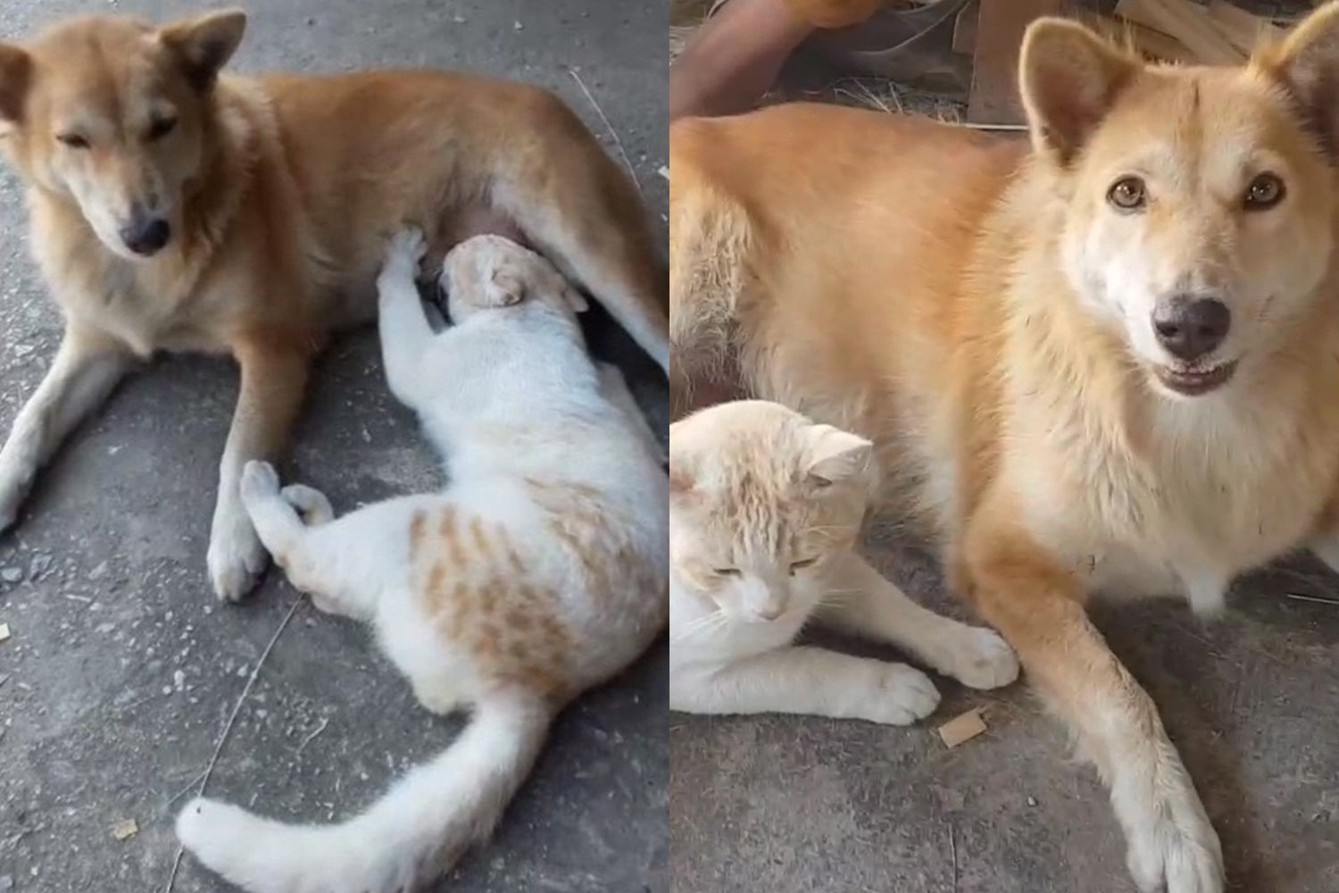 แม่หมารักลูกแมวให้ดูดนมตั้งแต่เกิด
