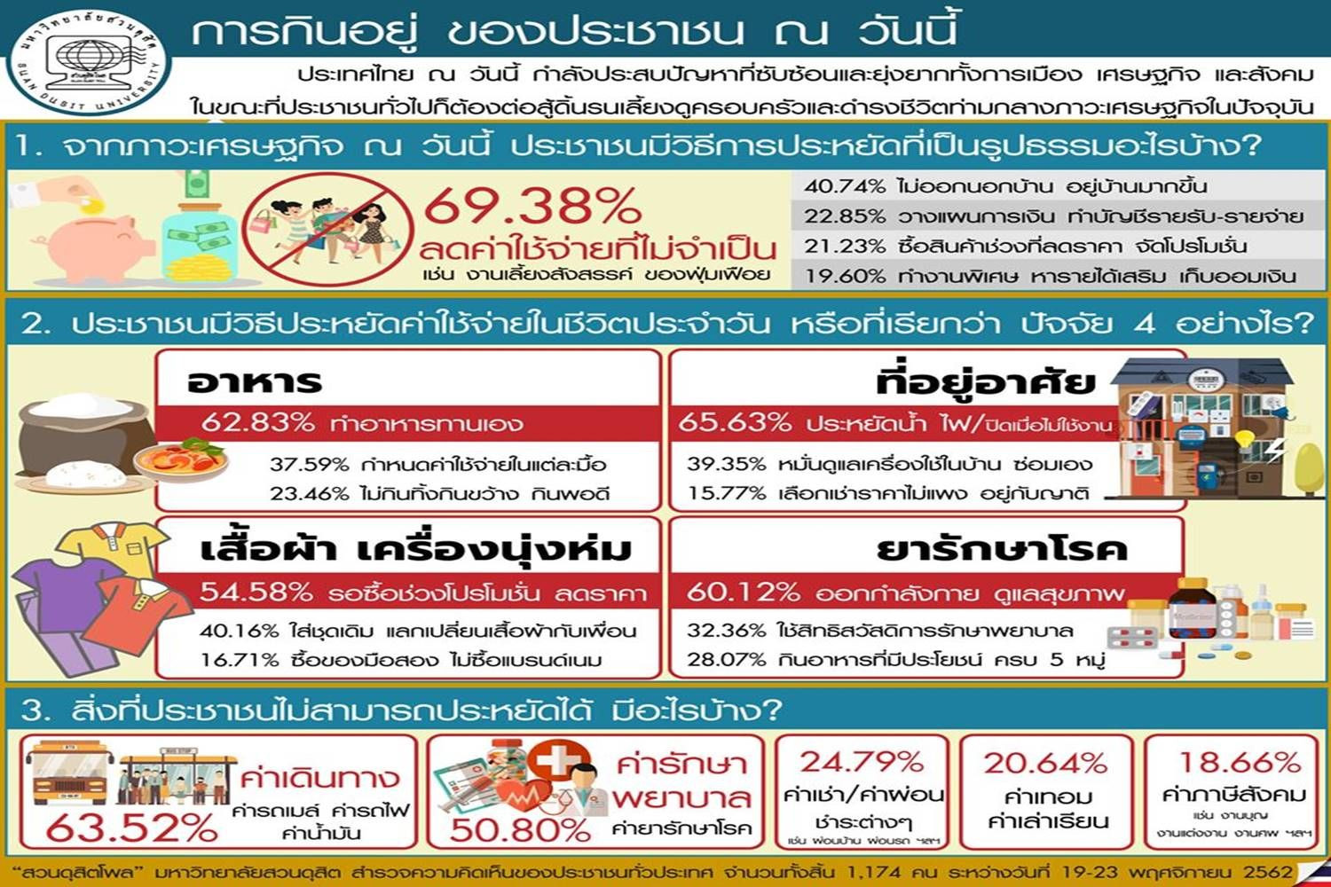 เมื่อวันที่ 24 พ.ย. 62 สวนดุสิตโพล มหาวิทยาลัยสวนดุสิต เปิดเผย ผลสำรวจความคิดเห็นเรื่อง "การกินอยู่ของประชาชน ณ วันนี้" โดยสำรวจประชาชนทั่วประเทศ จำนวนทั้งสิ้น 1,174 คน ระหว่างวันที่ 19-23 พ.ย. 2562 เพื่อสะท้อนความคิดเห็นของประชาชนที่มีต่อการดำเนินชีวิตประจำวัน จากกรณีประเทศไทย ณ วันนี้ กำลังประสบปัญหาที่ซับซ้อนและยุ่งยากทั้งการเมือง เศรษฐกิจ และสังคม ในขณะที่ประชาชนทั่วไปก็ต้องต่อสู้ดิ้นรนเลี้ยงดูครอบครัว และดำรงชีวิตท่ามกลางภาวะเศรษฐกิจในปัจจุบัน สรุปผลได้ ดังนี้