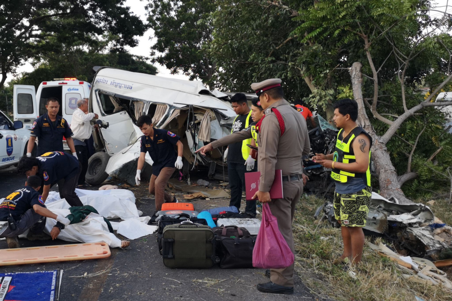 ทั้งนี้ เจ้าหน้าที่พบรถตู้ ยี่ห้อโตโยต้า สีขาว รุ่นคอมมิวเตอร์ ทะเบียน 30-0444 ราชบุรี ด้านหน้ารถเขียนชื่อ บุญผ่อง มัญญะหงส์ รถชนเข้ากับต้นไม้ใหญ่ บริเวณร่องกลางถนน แรงชนทำให้ต้นไม้โค่นและรากถูกถอนขึ้นมาจากพื้นดิน สภาพรถด้านหน้าพังยับเยิน ตั้งแต่เครื่องยนต์ จนถึงห้องโดยสารคนขับ ด้านข้างคนขับฉีกขาด หลังคารถเปิด ส่วนท้ายรถโผล่ออกมาที่ถนนด้านเลนขวามือกีดขวางการจราจร