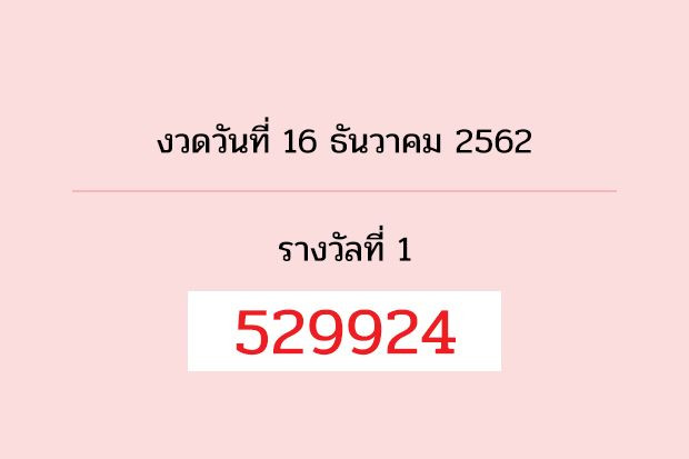 ผลสลากกินแบ่งรัฐบาลงวด 16 ธ.ค. 62 รางวัลที่1คือ 529924เลขหน้า3ตัว138,043 ท้าย3ตัว555,665 เลขท้าย 2 ตัว 97