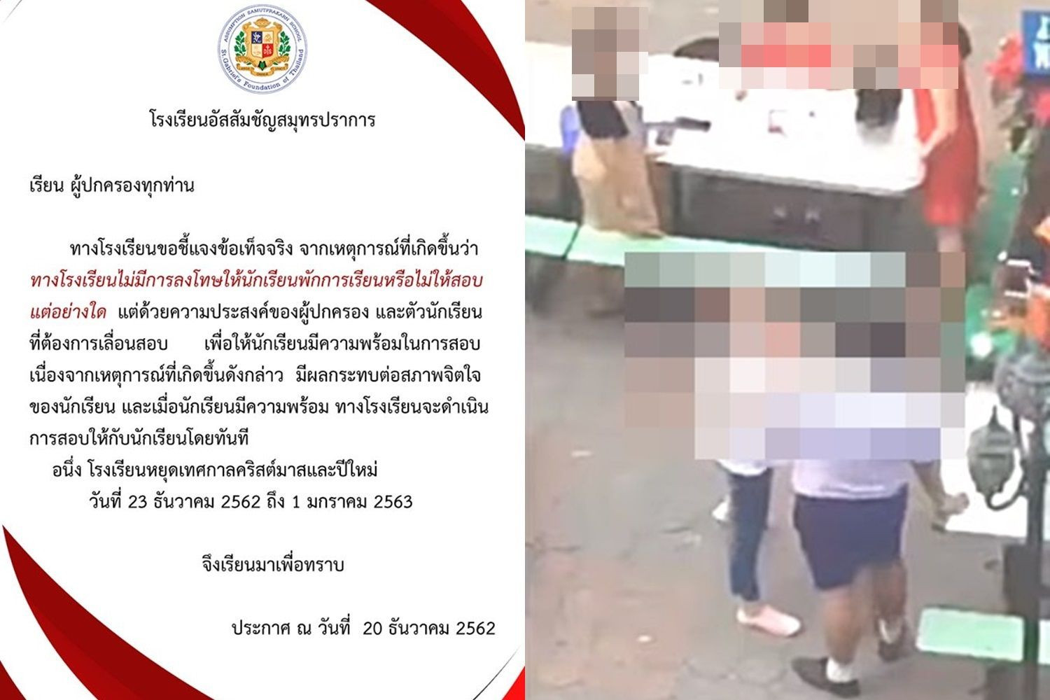 โรงเรียนอัญสัมชัญสมุทรปราการ ชี้แจงกรณี #อาม่าตบเด็ก ยันไม่ได้พักการเรียนนักเรียนคู่กรณี แต่เป็นความประสงค์ของผู้ปกครองและนักเรียนเองที่ต้องการขอเลื่อนสอบ และพร้อมจัดการสอบให้ทันทีเมื่อมีความพร้อม