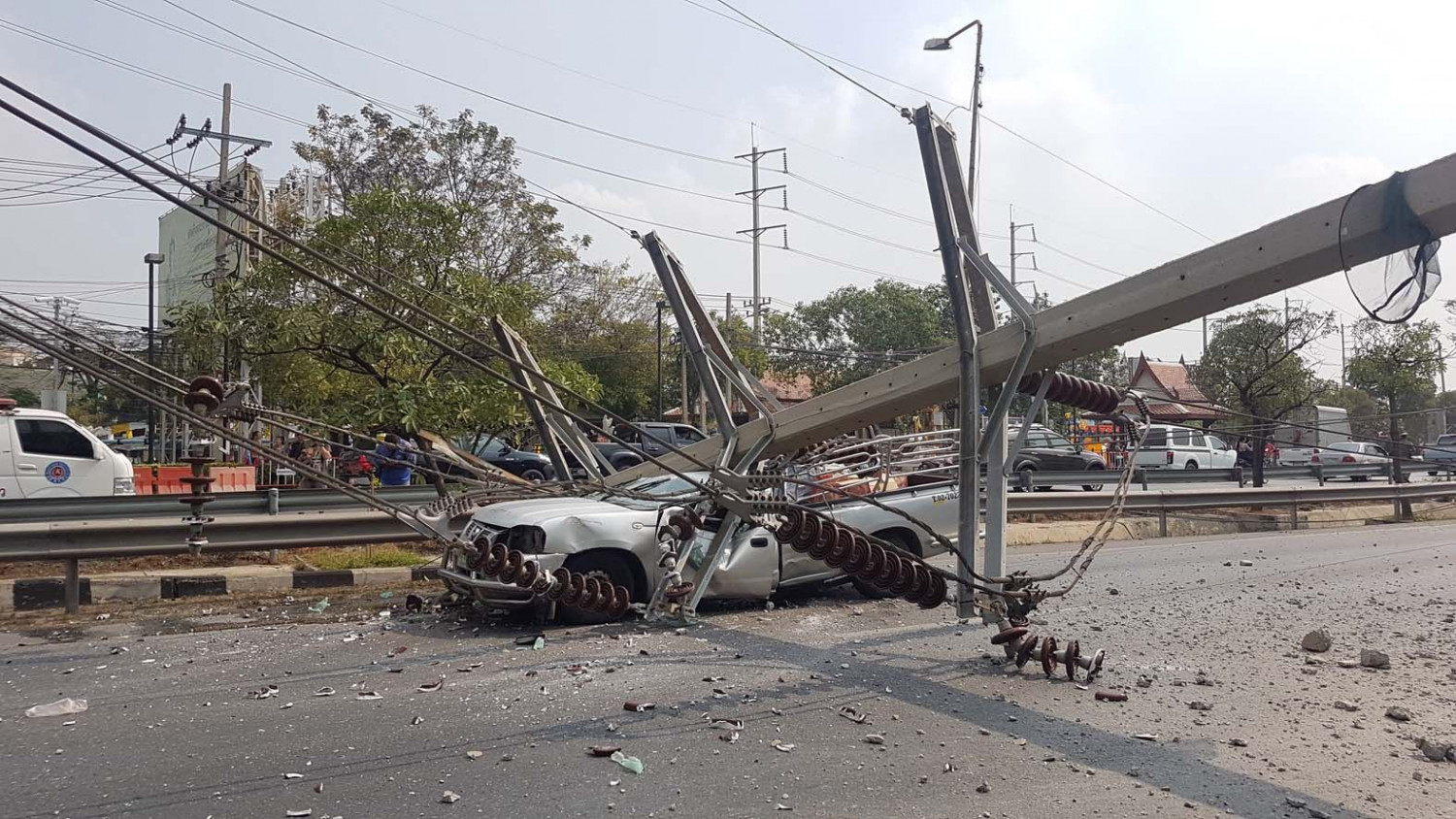 สมุทรปราการ-สาวซิ่งกระบะชนเสาไฟฟ้าหักล้มระเนระนาดกว่า 15 ต้น รถชาวบ้านพลอยซวยโดนถูกเสาไฟล้มทับเสียหายยับเยินอีกหลายคัน