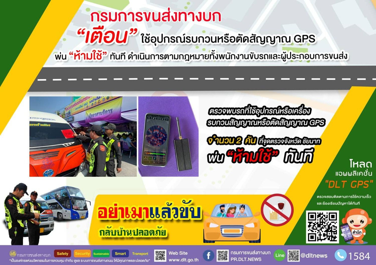 ทั้งนี้ฝากเตือนไปยังผู้ประกอบการขนส่งหรือผู้ขับรถบางรายที่หลบเลี่ยงการส่งข้อมูลการใช้รถโดยใช้อุปกรณ์หรือเครื่องรบกวนสัญญาณหรือตัดสัญญาณ GPS ทำให้ข้อมูล พิกัด ตำแหน่งเคลื่อนที่ของรถไม่สามารถส่งข้อมูลมายังศูนย์บริหารจัดการเดินรถระบบ GPS การกระทำดังกล่าวมีความผิดตามกฎหมายทั้งผู้ขายและผู้ใช้ ผู้ขับรถมีความผิดฐานไม่ปฏิบัติตามกฎกระทรวงความปลอดภัยในการขนส่ง ไม่ใช้เครื่องอุปกรณ์และส่วนควบของรถตามที่กฎหมายกำหนด ตามมาตรา 102 (4) ประกอบมาตรา 127 แห่งพระราชบัญญัติการขนส่งทางบก พ.ศ. 2522