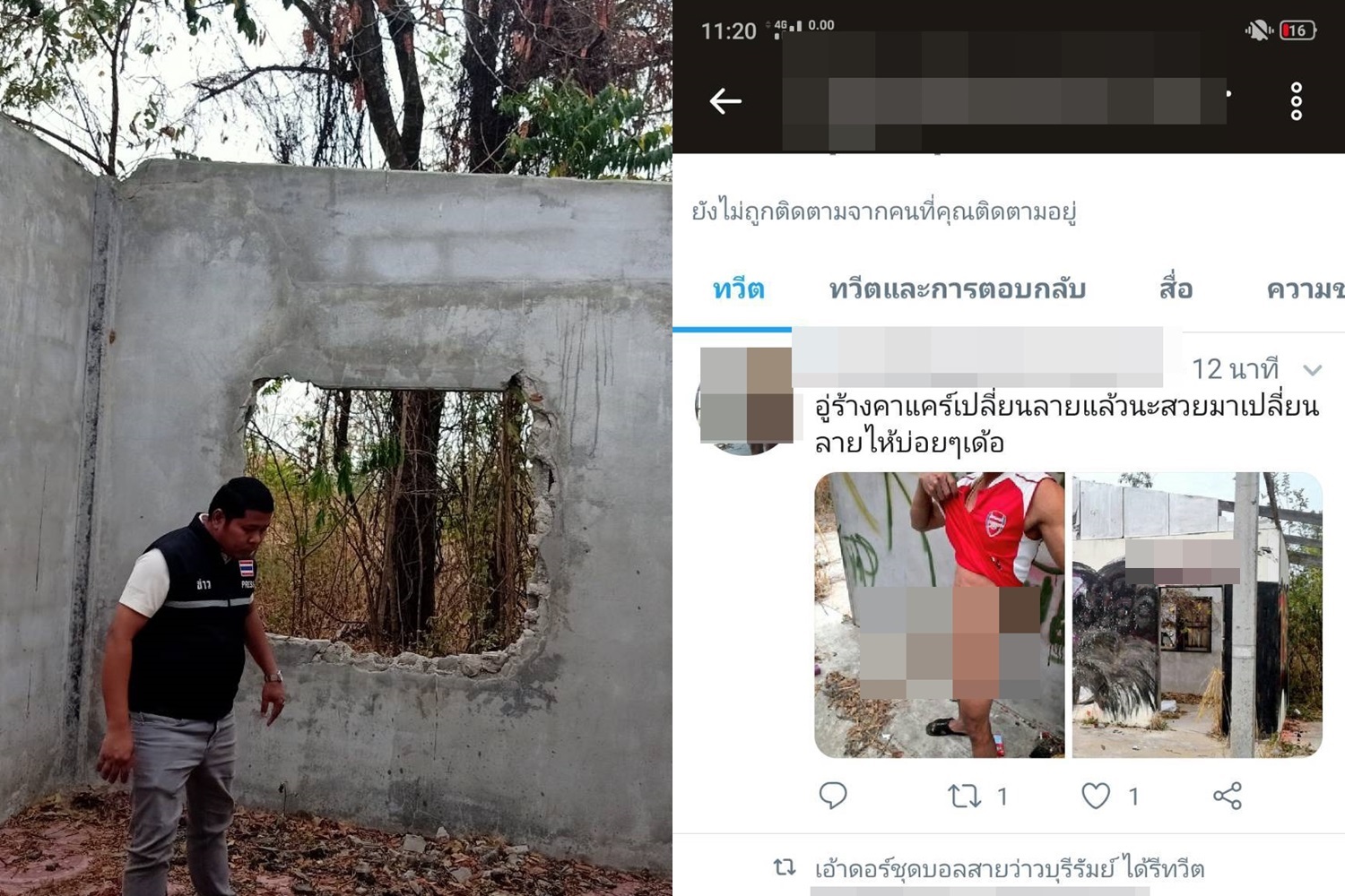 จากการตรวจสอบเบื้องต้นพบว่าผู้ใช้ทวิตเตอร์รายนี้ เพิ่งเปิดใช้งานเมื่อเดือนสิงหาคม 2562 โดยจะเลือกสมาชิกเป็นชาวอำเภอนางรองเท่านั้น ในทวิตยังมีการโพสต์ภาพในลักษณะลามกอนาจารอีกหลายรูป ส่วนใหญ่จะเป็นภาพผู้ชายสวมไอ้โม่งยืนโชว์อวัยวะเพศช่วยตัวเองในอาคารเก่า ในป่า อู่รถเก่า หรือรีสอร์ทเก่าที่ปล่อยทิ้งร้าง กระทั่งมีคนเข้าไปพบเห็นทวิตเตอร์นี้ มองว่าเป็นการกระทำที่ไม่เหมาะสมทั้งเกรงจะเกิดพฤติกรรมเลียนแบบ จึงได้แจ้งเจ้าหน้าที่ให้เข้าไปตรวจสอบและเร่งติดตามตัวผู้โพสต์มาดำเนินคดี