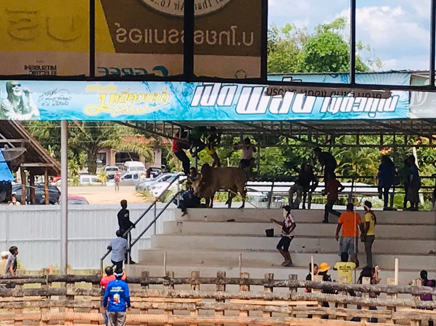วัวชนเมืองตรังคลั่งหลังแพ้คู่ต่อสู้พังประตูเหล็กไล่ขวิดคนดูหนีตายจ้าละหวั่น