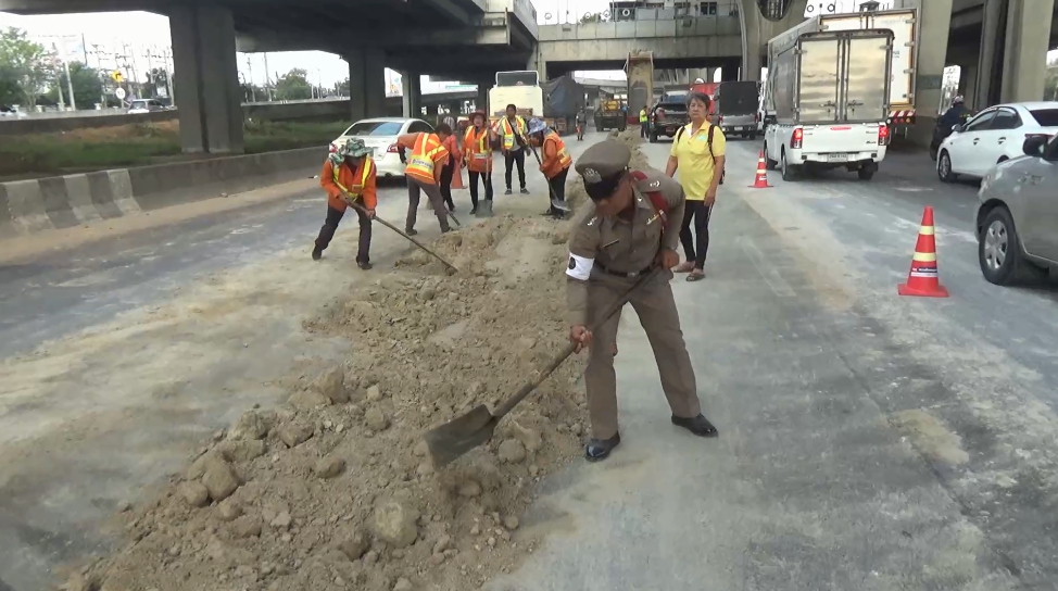 ทั้งนี้ ที่เกิดเหตุพบรถบรรทุกพ่วง 18 ล้อ หมายเลขทะเบียน หัวพ่วง 73 – 2439 ชลบุรี หมายเลขทะเบียน หางพ่วง 73 – 2440 ชลบุรี จอดอยู่ในเลนที่ 2 ด้านหลังได้รับความเสียหาย ห่างไปประมาณ 50 เมตร พบกระบะบรรทุกดินของรถคันดังกล่าวตั้งค้ำอยู่กับคานทางด่วนที่สูงจากพื้นดินประมาณ 5 เมตร โดยเทดินที่บรรทุกมาเป็นทางยาวกว่า 200 เมตร เจ้าหน้าที่ระดมกำลังมาเก็บดินที่อยู่บนพื้นผิวการจราจรใช้เวลากว่า 3 ชั่วโมง จึงเก็บและขนย้ายกระบะรถบรรทุกออกจากจุดดังกล่าวได้ ทำให้รถติดเป็นทางยาวหลายกิโลเมตร