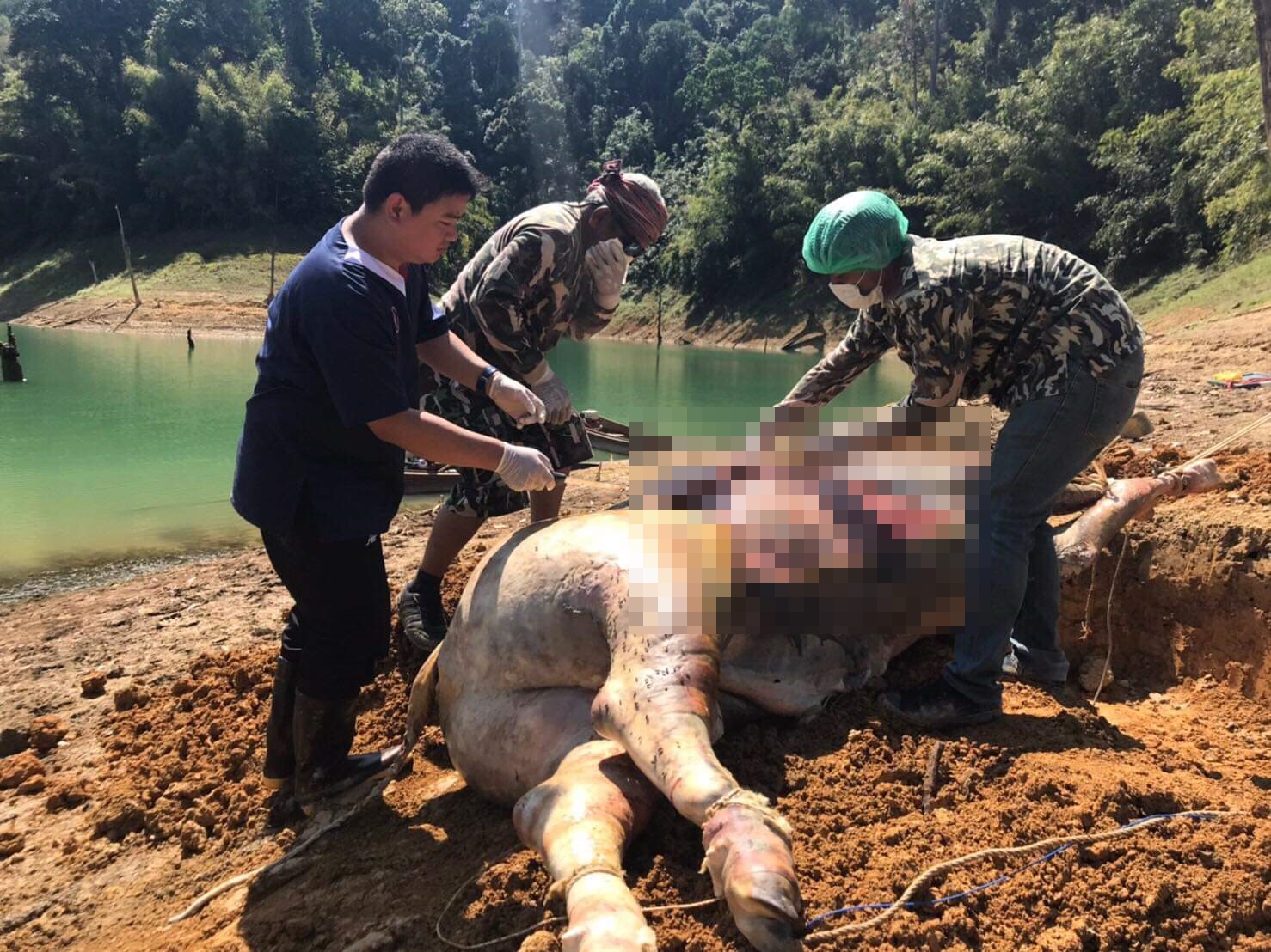 เมื่อวันที่ 15 มี.ค.นายบรรณรักษ์ เสริมทอง ผอ.สำนักบริหารพื้นที่อนุรักษ์ที่ 4 (สุราษฎร์ธานี) เปิดเผยว่า กรณีพบซากกระทิงตัวใหญ่ในบริเวณคลองยาว ตอนเหนืออ่างเก็บน้ำเขื่อนรัชชประภา หมู่ที่ 3 ต.เขาพัง อ.บ้านตาขุน จ.สุราษฎร์ธานี ได้มอบให้เจ้าหน้าที่สัตวแพทย์ ร่วมกับนักวิชาการสัตวบาล ประจำส่วนอนุรักษ์สัตว์ป่า, หัวหน้าเขตรักษาพันธุ์สัตว์ป่าคลองแสง , หัวหน้าอุทยานแห่งชาติเขาสก , หัวหน้าสถานีวิจัยสัตว์ป่าคลองแสงและเจ้าหน้าที่ร่วมกันตรวจสอบข้อเท็จจริงพบเป็นซากกระทิง เพศผู้ ความยาว 196 เซนติเมตร ความสูง 136 เซนติเมตร ตรวจสอบภายนอกไม่พบบาดแผลบนลำตัว ส่วนบาดแผลบริเวณลำคอมีลักษณะเปื่อยยุ่ย คาดว่าเสียชีวิตมาแล้ว 4-5 วัน ได้ทำการผ่าซากพบอวัยวะเน่าเปลือยเนื่องจากแช่อยู่ในน้ำกับสภาพอากาศที่ร้อนจัด จึงเก็บตัวอย่างชิ้นเนื้อและอวัยวะบางส่วนส่งตรวจที่ห้องปฏิบัติการ นอกจากนี้ในกระเพาะอาหารพบเศษหญ้า เศษอาหารอัดแน่นอยู่เต็ม กระทิงตัวนี้จึงมีสุขภาพที่แข็งแรง และหลังผ่าพิสูจน์ได้ย้ายซากลงหลุมราดด้วยน้ำยาฆ่าเชื้อก่อนฝังกลบ
