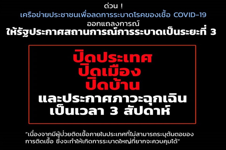 จากสถานการณ์การแพร่ระบาดของเชื้อ COVID-19 ในประเทศไทยที่ปัจจุบันมีผู้ติดเชื้ออย่างน้อย 212 คน เสียชีวิต 1 คน เข้าเกณฑ์เฝ้าระวังโรค 7,546 คน (ข้อมูล ณ วันที่ 18 มีนาคม 2563 เวลา 11.00 น.) โดยที่ปรากฎตามข้อเท็จจริงว่าพบการแพร่ระบาดไปทั่วทุกภูมิภาคของไทย ไม่จำกัดอยู่เพียงสถานที่ใดสถานที่หนึ่ง มีผู้ป่วยติดเชื้อภายในประเทศที่ไม่สามารถระบุต้นตอของการติดเชื้อได้อย่างชัดเจน รวมทั้งผู้ป่วยส่วนใหญ่อาการไม่รุนแรง ไม่ได้มารักษาในทันทีตั้งแต่วันแรกที่มีอาการป่วย ทั้งยังไม่มีพฤติกรรมการป้องกันการแพร่เชื้อที่เหมาะสม และมาตรการของรัฐมีความล่าช้า ไม่ทันการณ์ อีกทั้งเครื่องมือ อุปกรณ์ และบุคลากรทางการแพทย์อาจไม่เพียงพอต่อการรับมือวิกฤตการณ์ครั้งนี้ได้อย่างมีประสิทธิภาพ ตลอดจนมีความเสี่ยงสูงมากกว่าบุคลากรทางการแพทย์ อาจติดเชื้อ COVID-19 ทั้งจากการตรวจผู้ป่วยโดยตรง หรือขั้นตอนการให้การรักษาโดยเฉพาะอย่างยิ่งการใช้เครื่องดูดเสมหะในผู้ป่วยหนักอาจแปลงสภาพการ ติดเชื้อจากสภาพเสมหะของเหลวกลายเป็นการติดเชื้อในละอองอากาศในโรงพยาบาลนั้นเครือข่ายประชาชนเพื่อลดการระบาดของเชื้อ COVID-19 มีความกังวลต่อสถานการณ์ดังกล่าวเป็นอย่างยิ่ง จึงขอเรียกร้องมาตรการปิดประเทศ ปิดเมือง ปิดบ้าน และประกาศภาวะฉุกเฉินระยะสั้น เป็นเวลา 3 สัปดาห์ เพื่อหยุดการแพร่กระจายของโรค และทำให้บ้านเมืองกลับคืนสู่สภาพปกติโดยเร็วที่สุด รวมทั้งหยุดยั้งผลกระทบทางเศรษฐกิจที่จะทอดเวลาออกไปนานขึ้น หากไม่มีมาตรการที่เข้มข้น เพียงพอ โดยมีรายละเอียดดังนี้