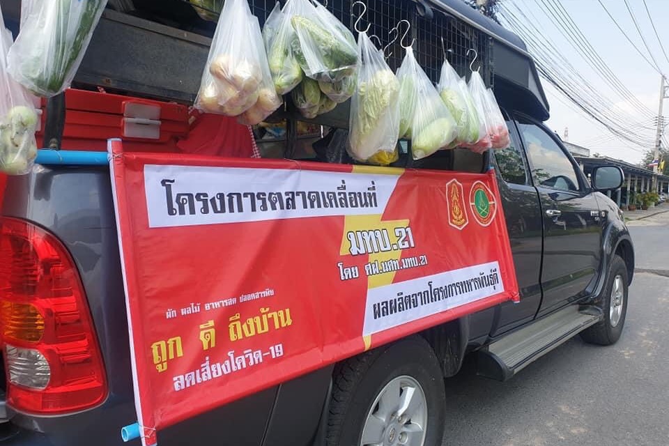 ที่ชุมชนบ้านพักทหารหนองบัวรอง อำเภอเมือง จังหวัดนครราชสีมา พลตรีเกียรติศักดิ์ วิเวก ผู้บัญชาการมณฑลทหารบกที่ 21 กองทัพภาคที่ 2 ได้ออกประชาสัมพันธ์นำผลผลิตจากโครางการทหารพันธุ์ดี ออกหน่วยรถตลาดสดเคลื่อนที่ หรือรถพุ่มพวง จำหน่ายสินค้าให้กับชาวบ้านและกำลังพลตามบ้านพักในค่ายทหาร เพื่อเป็นการช่วยชาวบ้าน และกำลังพลที่มีรายได้น้อย เป็นการช่วยให้ไม่ต้องออกจากบ้านไปในแหล่งที่เสี่ยงต่อไวรัสโควิด-19 ซึ่งได้รับความสนใจจากลูกค้ามาเลือกซื้อกันอย่างคึกคัก.