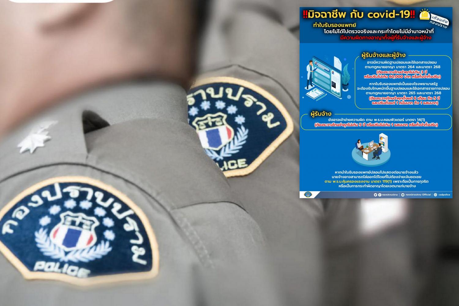 เพจฯกองปราบปราม เตือนระวังมิจฉาชีพรับทำใบรับรองแพทย์ปลอมช่วงโควิดระบาด ย้ำโทษจำและปรับหนัก-ถูกไล่ออกจากงานโดยไม่ได้เงินชดเชย