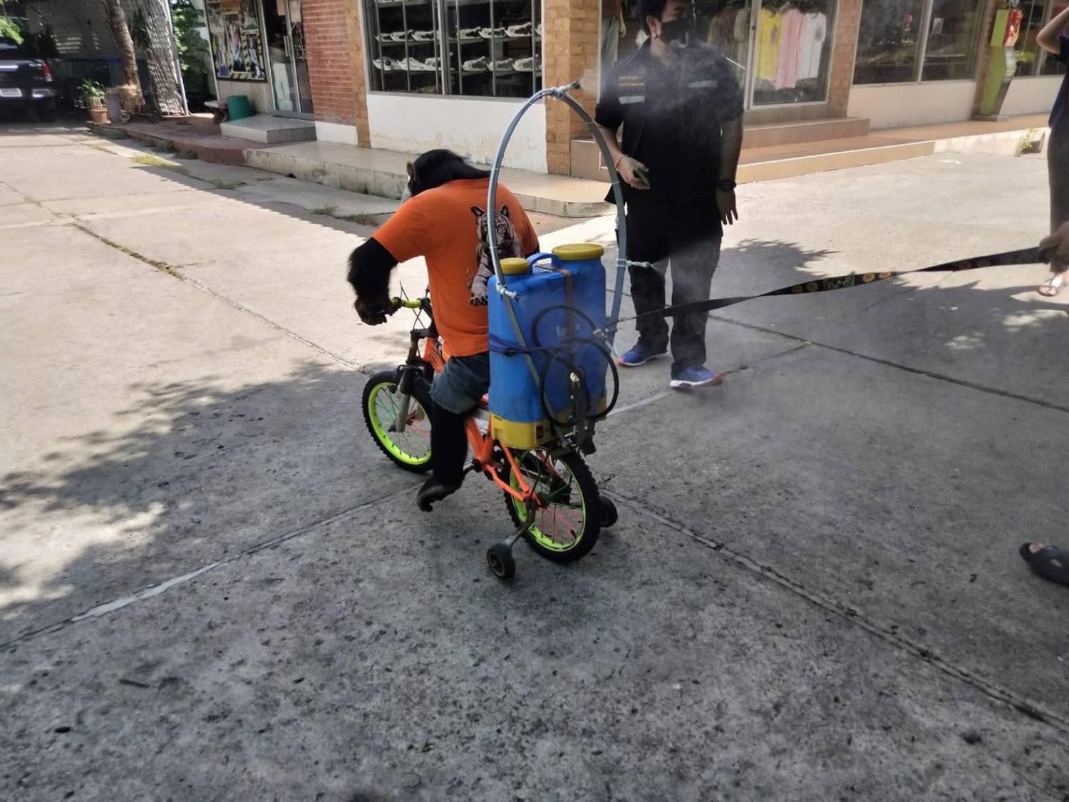 ทั้งนี้ นายอุเทน ยังประภากร รักษาการประธานกรรมการบริษัทฟาร์มจระเข้และสวนสัตว์สมุทรปราการ ได้นำเจ้าหน้าที่ไปดูลิงชิมแปนซีตัวดังกล่าว พร้อมนำจักรยานและถังพ่นยา ตามที่ปรากฏในคลิ มาให้เจ้าหน้าที่ร่วมตรวจสอบ จาการสอบถามพี่เลี้ยงของลิงชิมแปนซีตัวดังกล่าว ได้รับคำชี้แจงว่า พฤติกรรมการขี่จักรยานลิงตัวนี้ชอบทำเป็นประจำ ถือเป็นการออกกำลังกายและผ่อนคลาย ส่วนถังฉีดยาได้ติดตั้งไว้บนตะแกรงท้ายจักรยาน ภายในบรรจุน้ำยาฆ่าเชื้อเดทตอล ชนิดที่ใช้กับร่างกายได้ เจือจางด้วยน้ำสะอาด ทำงานด้วยแบตเตอรี่ ติดตั้งหัวฉีดพ่นไปทางด้านหลัง