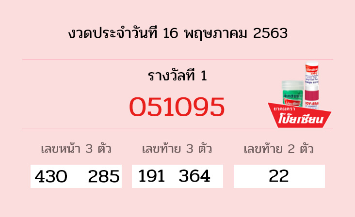 ผลการออกรางวัลสลากกินแบ่งรัฐบาล งวดวันที่ 16 พฤษภาคม 2563 รางวัลที่1 คือ 051095 3ตัวหน้า430 285 ท้าย3ตัว 191 364 ท้าย2ตัว 22