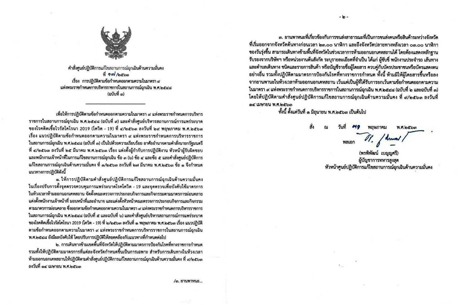 ผู้บัญชาการทหารสูงสุด ออกคำสั่ง ให้ยานพาหนะขนส่งสาธารณะคน-สินค้า ที่เริ่มออกจากจังหวัดต้นทางก่อน5 ทุ่ม และถึงจังหวัดปลายทางหลังตี3 ของวันรุ่งขึ้น สามารถเดินทางข้ามพื้นที่จังหวัดในช่วงเคอร์ฟิวได้