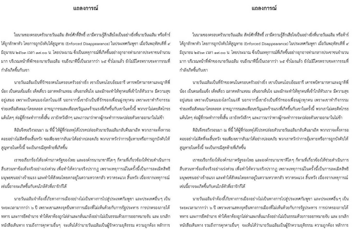 ครอบครัว"วันเฉลิม"แถลงการณ์จี้ภาครัฐหาข้อเท็จจริงเหตุถูกอุ้มในกัมพูชา
