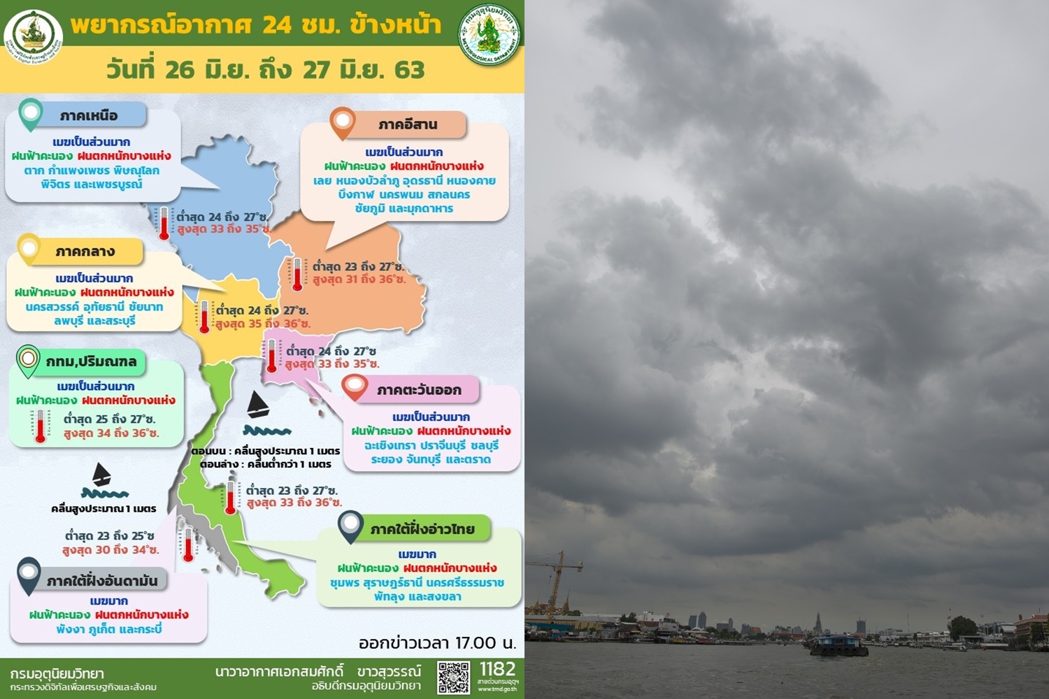 กรุงเทพมหานครและปริมณฑล เมฆเป็นส่วนมาก กับมีฝนฟ้าคะนอง ร้อยละ 40 ของพื้นที่อุณหภูมิต่ำสุด 25-27 องศาเซลเซียสอุณหภูมิสูงสุด 34-36 องศาเซลเซียสลมตะวันตกเฉียงใต้ ความเร็ว 10-30 กม./ชม.