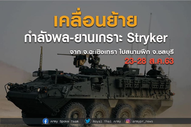 เมื่อวันที่ 22 ส.ค. เพจเฟซบุ๊ก Army Spoke Team แจ้งว่า กองทัพบกแจ้งเคลื่อนกำลังพล ยานเกราะStryker จาก ฉะเชิงเทรา ไปสนามฝึกที่ อ.ศรีราชา จ.ชลบุรี ใน 23-28 ส.ค.63