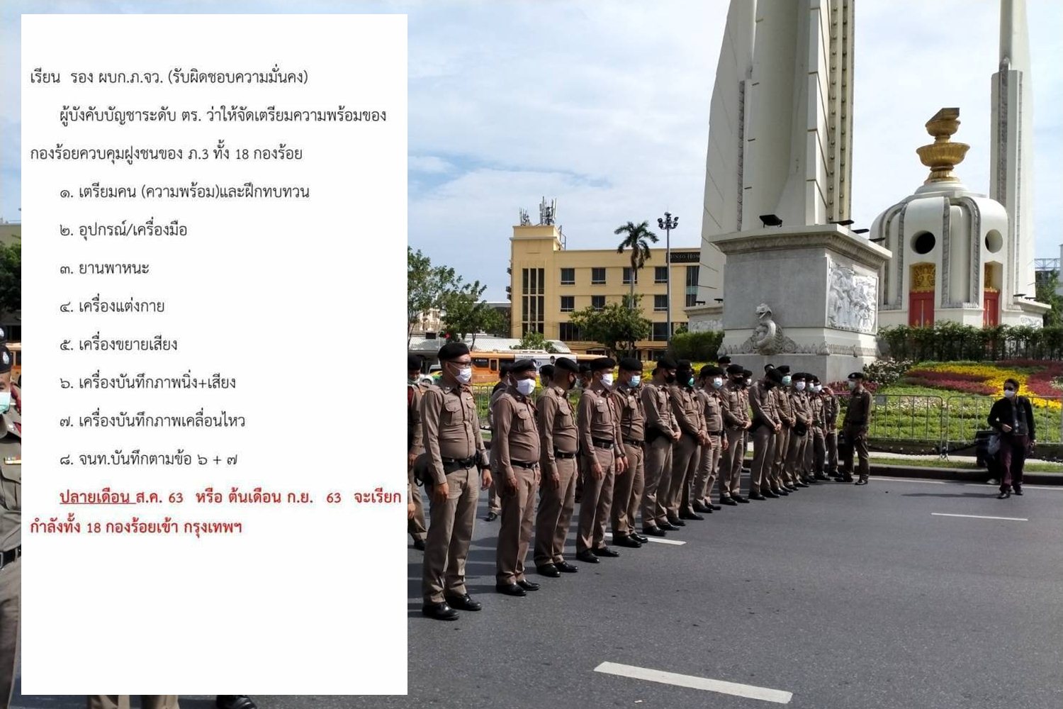 เมื่อวันที่ 24 ส.ค. 63 ผู้สื่อข่าวรายงานว่า ตำรวจภูธรภาค3 และ ภาค 7 ได้มีคำสั่งเรียกฝึกกองร้อยควบคุมฝูงชนของหน่วยในสังกัด โดยมีการระบุว่า ปลายเดือน ส.ค. 63 หรือ ต้นเดือนก.ย. 63 จะมีการเรียกกำลังจากกองร้อยควบคุมฝูงชนเข้ากรุงเทพฯ