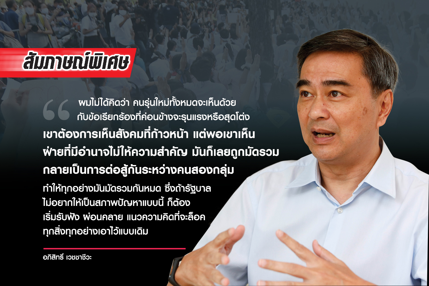 “ผมไม่ได้คิดว่า คนรุ่นใหม่ทั้งหมดจะเห็นด้วยกับข้อเรียกร้องที่ค่อนข้างจะรุนแรงหรือสุดโต่ง เขาต้องการเห็นสังคมที่ก้าวหน้า แต่พอเขาเห็นฝ่ายที่มีอำนาจไม่ให้ความสำคัญ มันก็เลยถูกมัดรวมกลายเป็นการต่อสู้กันระหว่างคนสองกลุ่มทำให้ทุกอย่างมันมัดรวมกันหมด ซึ่งถ้ารัฐบาลไม่อยากให้เป็นสภาพปัญหาแบบนี้ก็ต้องเริ่มรับฟัง ผ่อนคลาย แนวความคิดที่จะล็อคทุกสิ่งทุกอย่างเอาไว้แบบเดิม” อภิสิทธิ์ กล่าวทิ้งท้าย