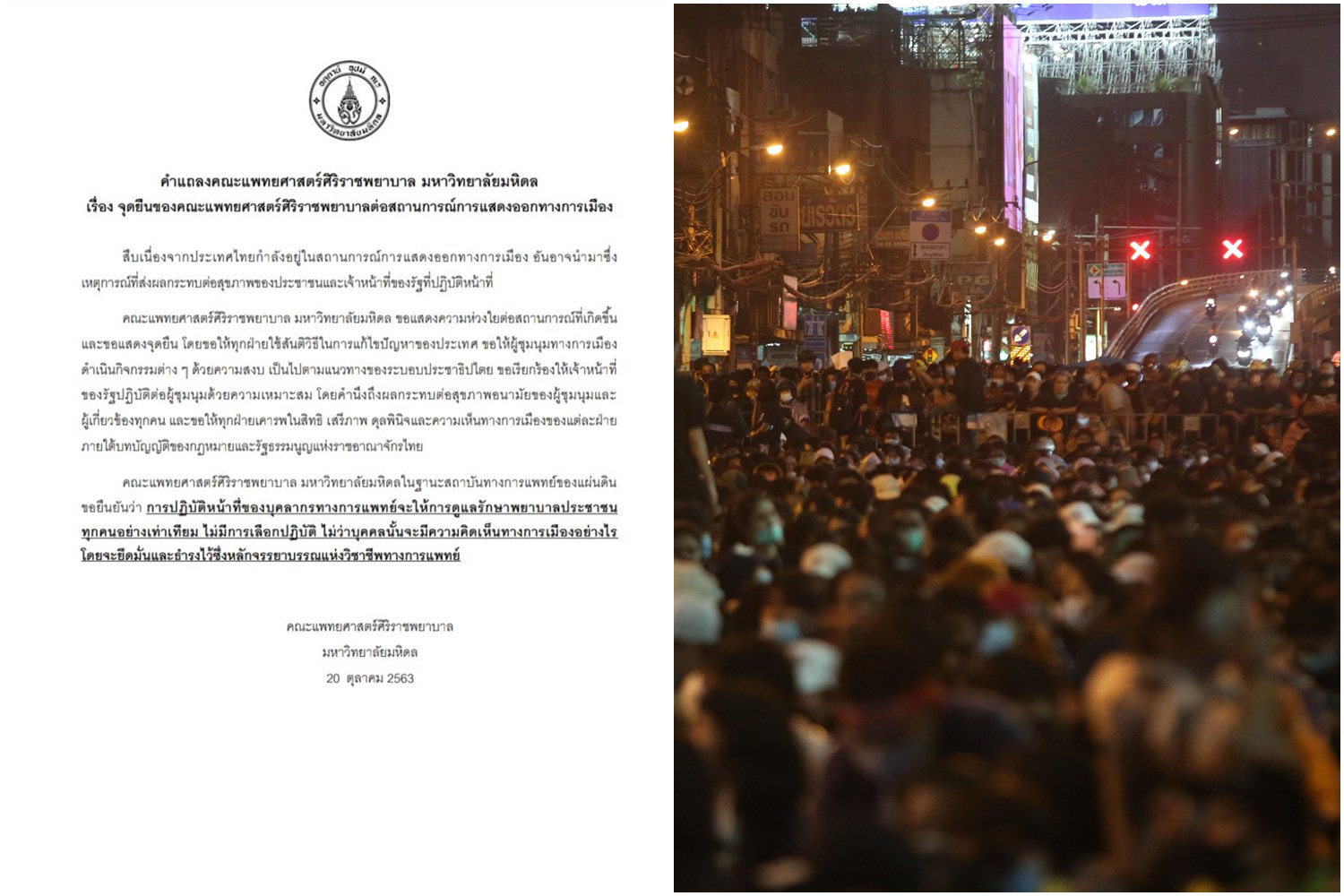 เมื่อวันที่ 20 ต.ค. 63 คณะแพทยศาสตร์ศิริราชพยาบาล มหาวิทยาลัยมหิดล ได้แถลง เรื่องจุดยืนของคณะแพทยศาสตร์ศิริราชพยาบาลต่อสถานการณ์การแสดงออกทางการเมือง โดยมีเนื้อหาดังนี้
