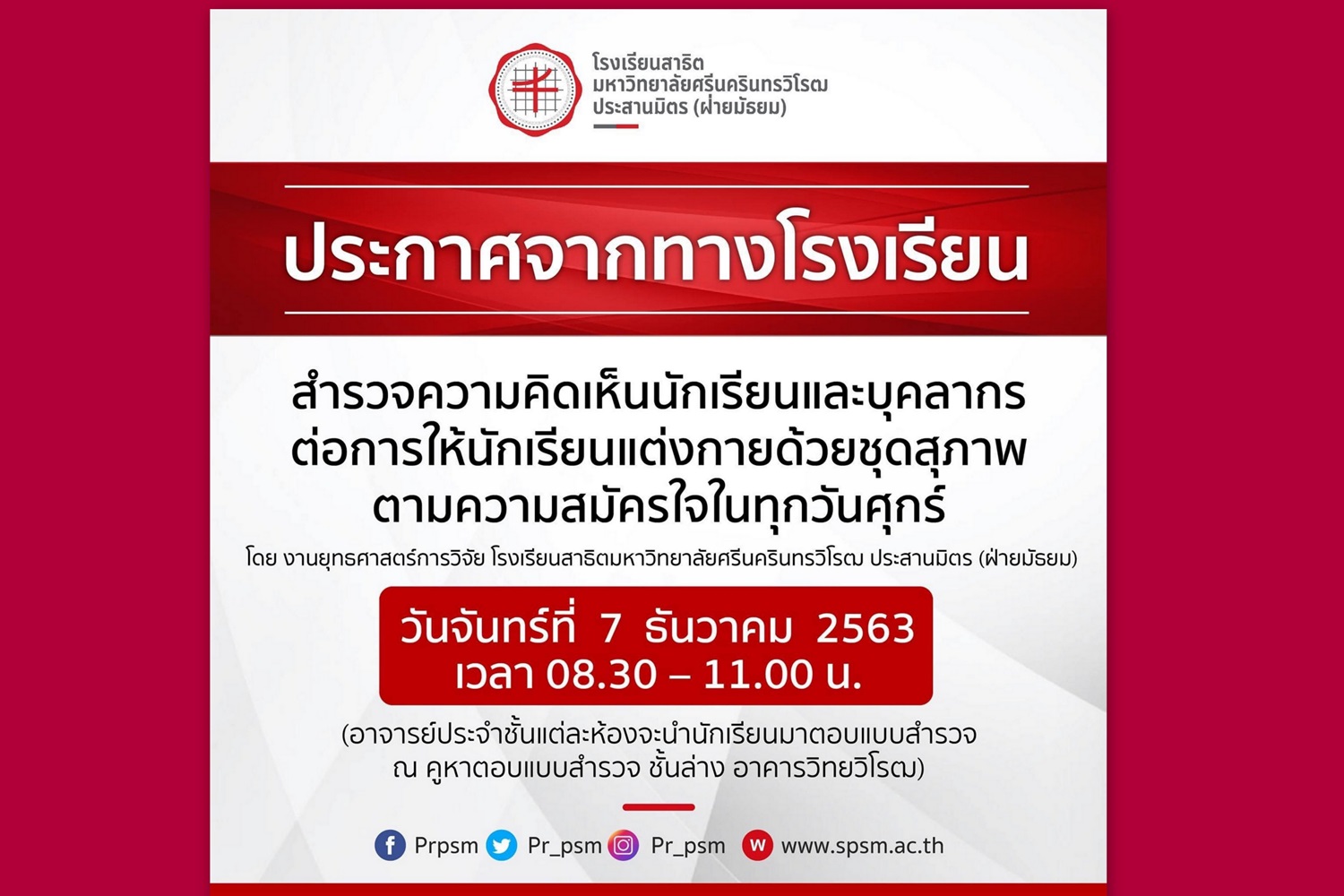 โรงเรียนสาธิต มศว ประสานมิตร (ฝ่ายมัธยม) ประกาศจากทางโรงเรียนผ่านเฟซบุ๊ก เรื่องสำรวจความคิดเห็นนักเรียนและบุคลากรต่อการให้นักเรียนแต่งกายด้วยชุดสุภาพตามความสมัครใจในทุกวันศุกร์ จัดโดยงานยุทธศาสตร์การวิจัยของโรงเรียน ในวันที่7ธ.ค.63 ระหว่างเวลา 08.30-11.00น. ซึ่งอาจารย์ประจำชั้นในแต่ละห้องจะนำนักเรียนมาตอบแบบสำรวจ ณ คูหาตอบแบบสำรวจ ชั้นล่าง อาคารวิทยวิโรฒ